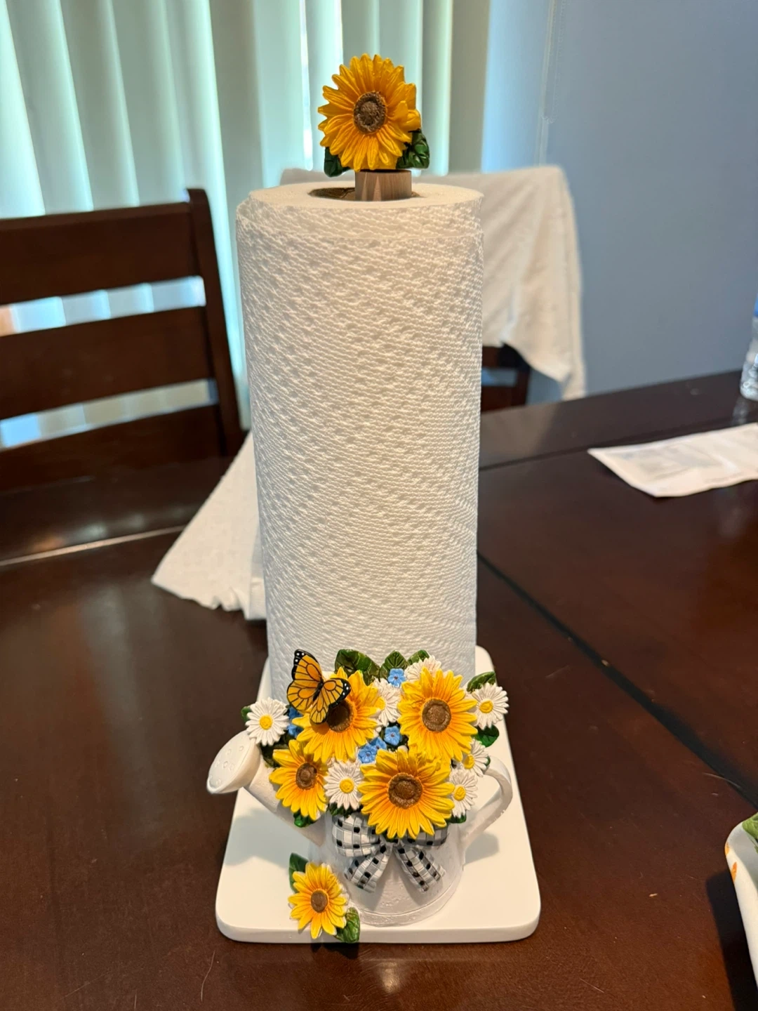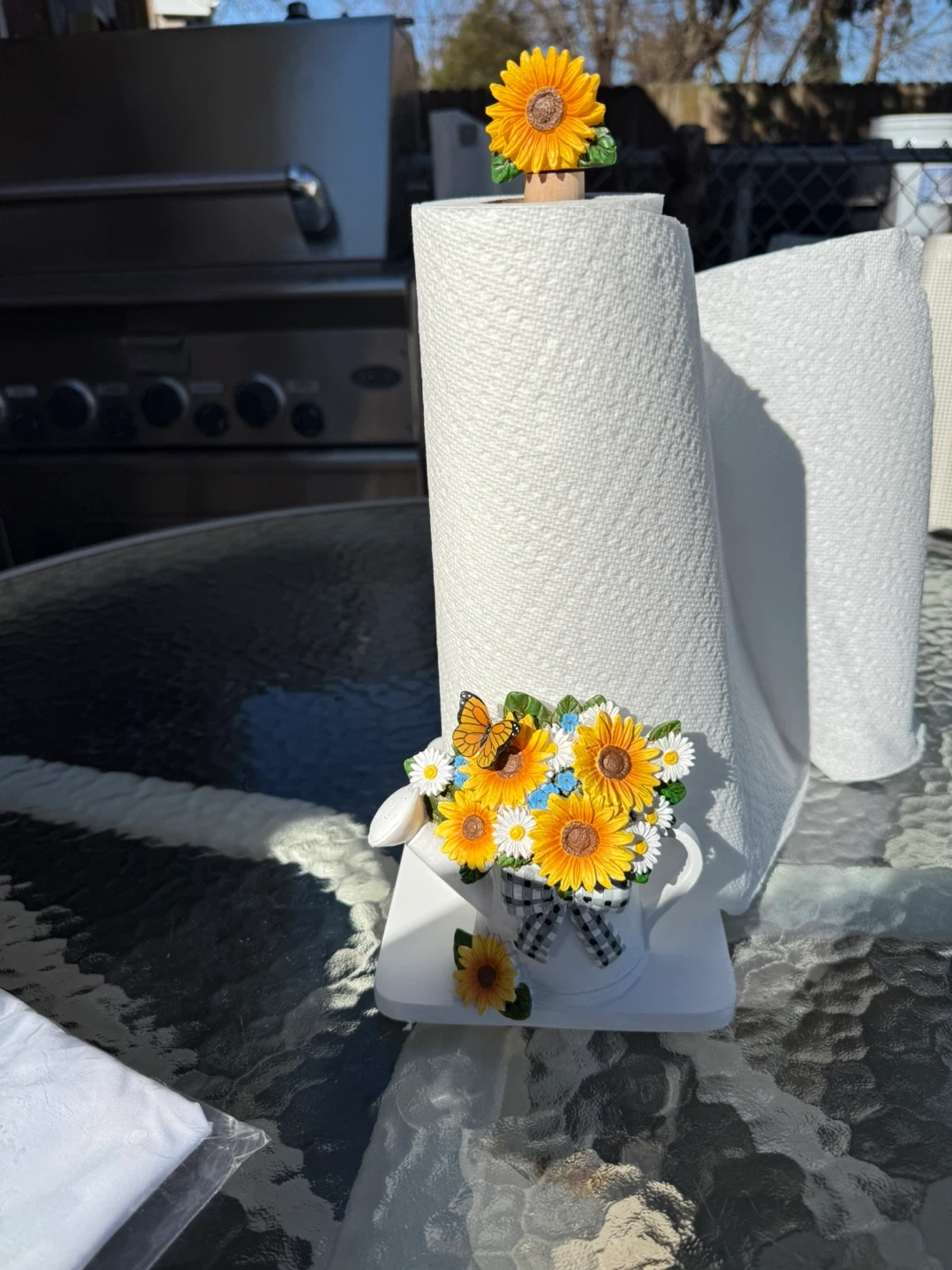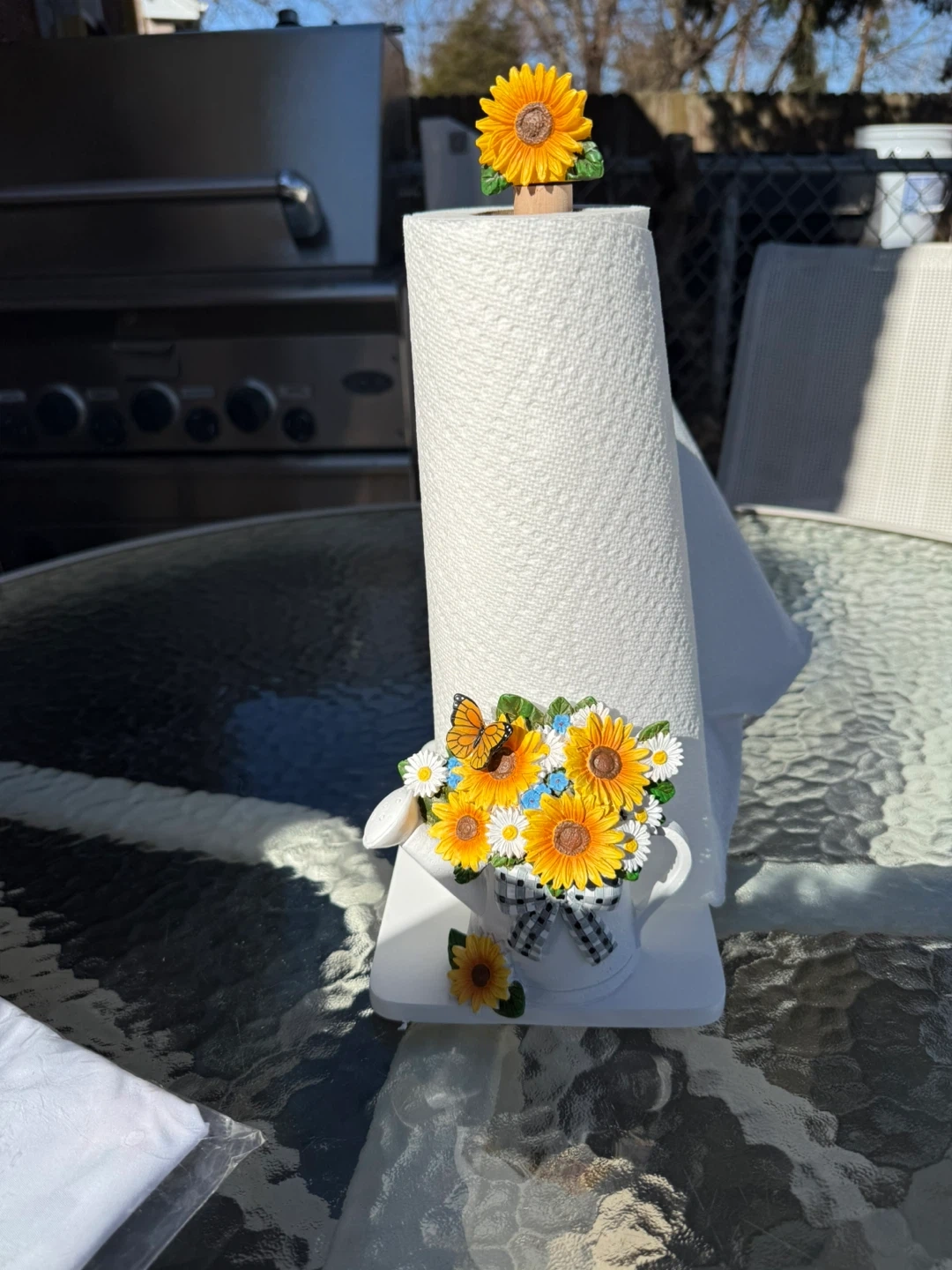 Decorative paper towel holder featuring a watering can base adorned with sunflowers, daisies, and a butterfly. It has a rustic checkered bow detail and a sunflower topper. This item adds a charming touch to any kitchen counter!