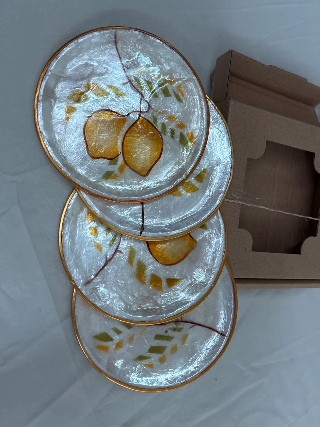 These beautiful coasters are made from Capiz shells, found in the coastal waters of the Philippines. They're translucent and have a unique pearlescent shine. This set of 4 coasters comes in its original box and is ready to add a touch of elegance to your home.