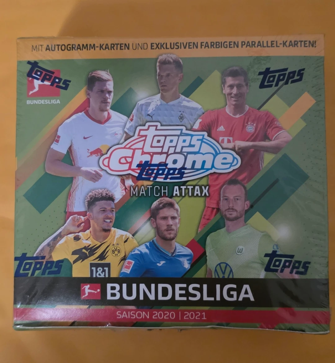 Selling a sealed box of Topps Chrome Bundesliga Match Attax from the 2020/2021 season! It includes 18 packs per box, with 4 cards per pack, totaling 200 cards. Great for collectors!