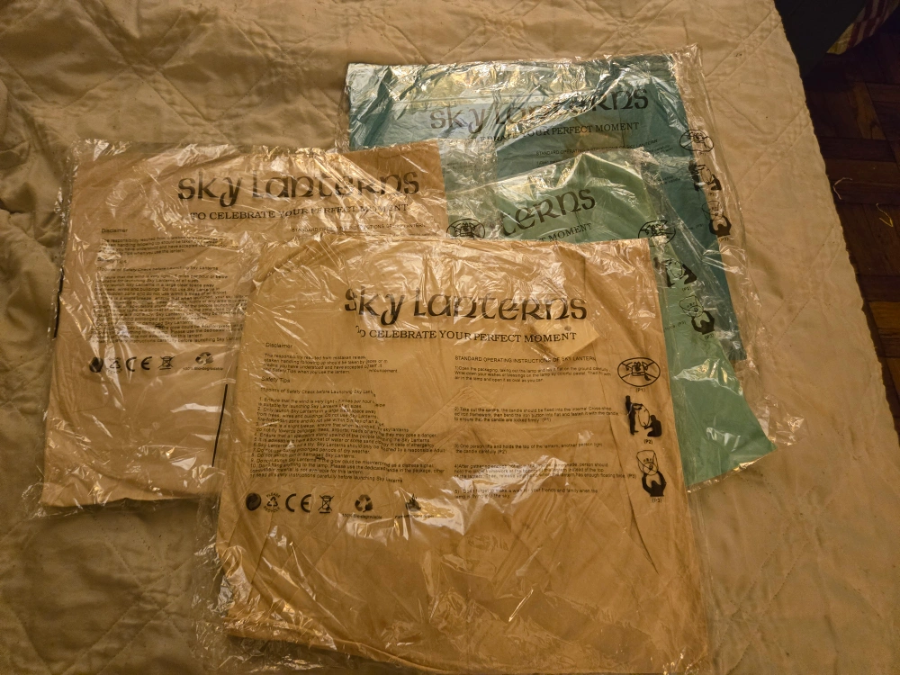 I have sky lanterns to give away. They're perfect for celebrating a special moment. Contruct, personalize and send into the air. The package includes all you need including standard operating instructions to ensure a safe and memorable experience. Each lantern is designed to be lightweight and create a beautiful display in the sky. A paper product that you can personalize.