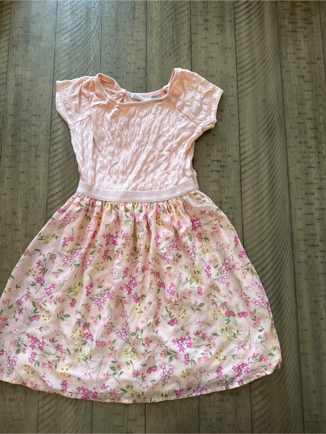 Cute short-sleeve dress with a pastel pink textured bodice and a floral print skirt. It's perfect for spring or summer occasions!