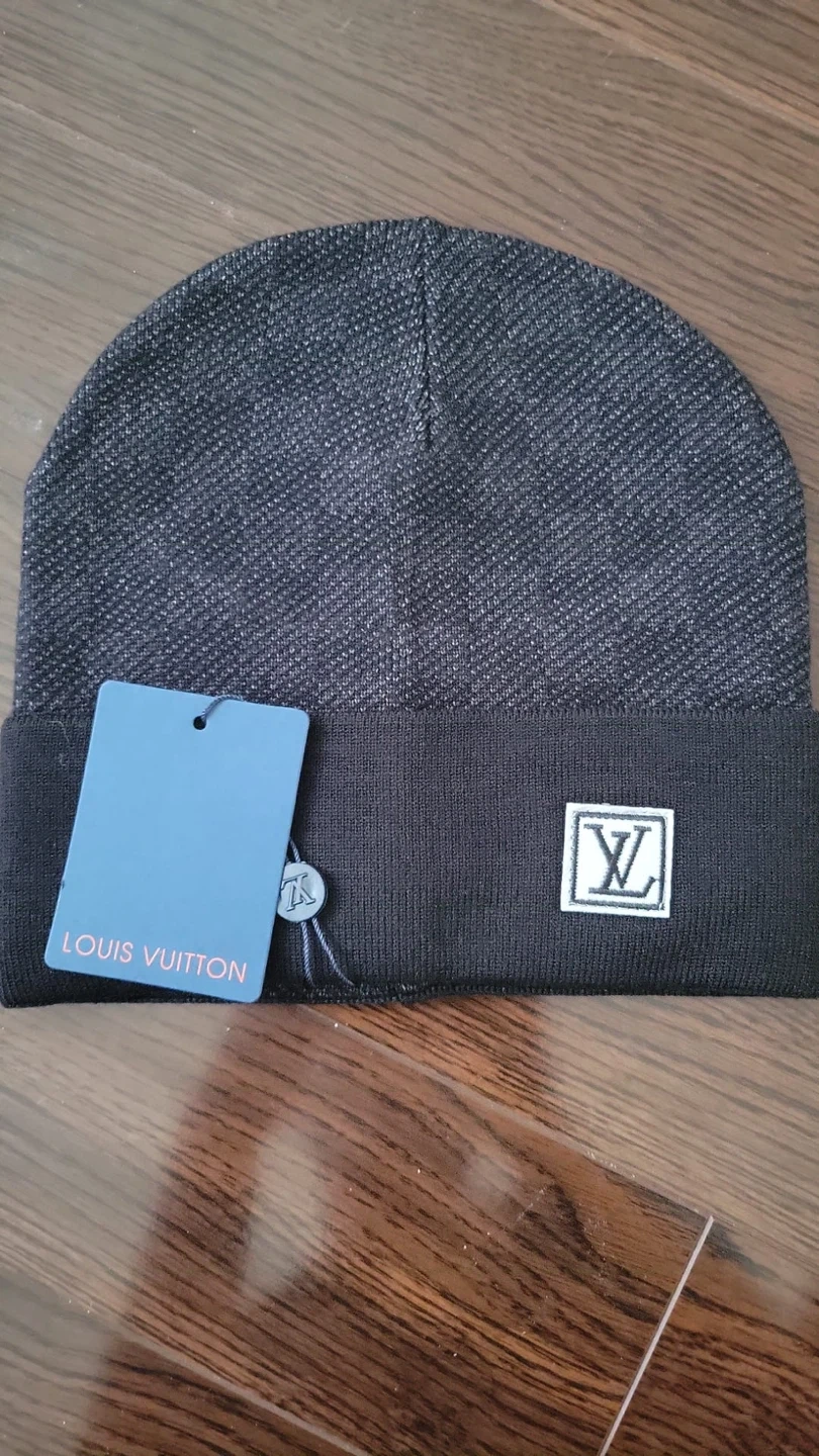 Louis Vuitton knitted beanie. It's dark grey and black with the LV logo patch on the front. Comes with original packaging.
