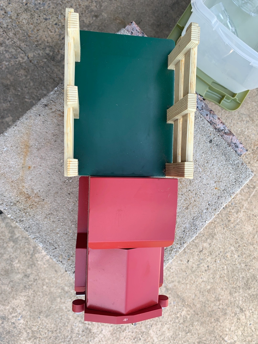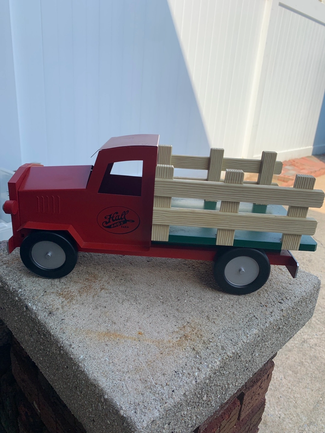 Vintage Hall Bros Farm decorative truck. It's red with a green truck bed and a wood-look fence. Great for adding a touch of vintage charm to your home!