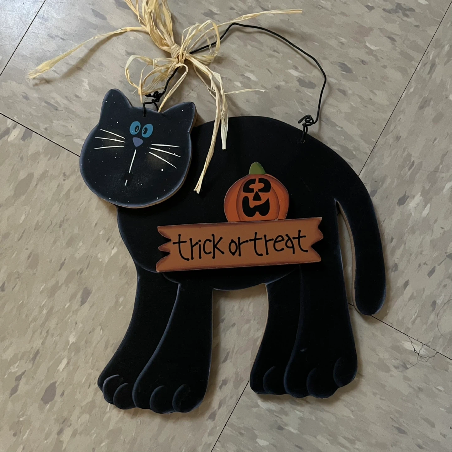 391Cute Halloween decoration featuring a black cat with a pumpkin and a "trick or treat" sign! Perfect for adding a spooky touch to your home this season. For pick up in Palisades Park, NJ