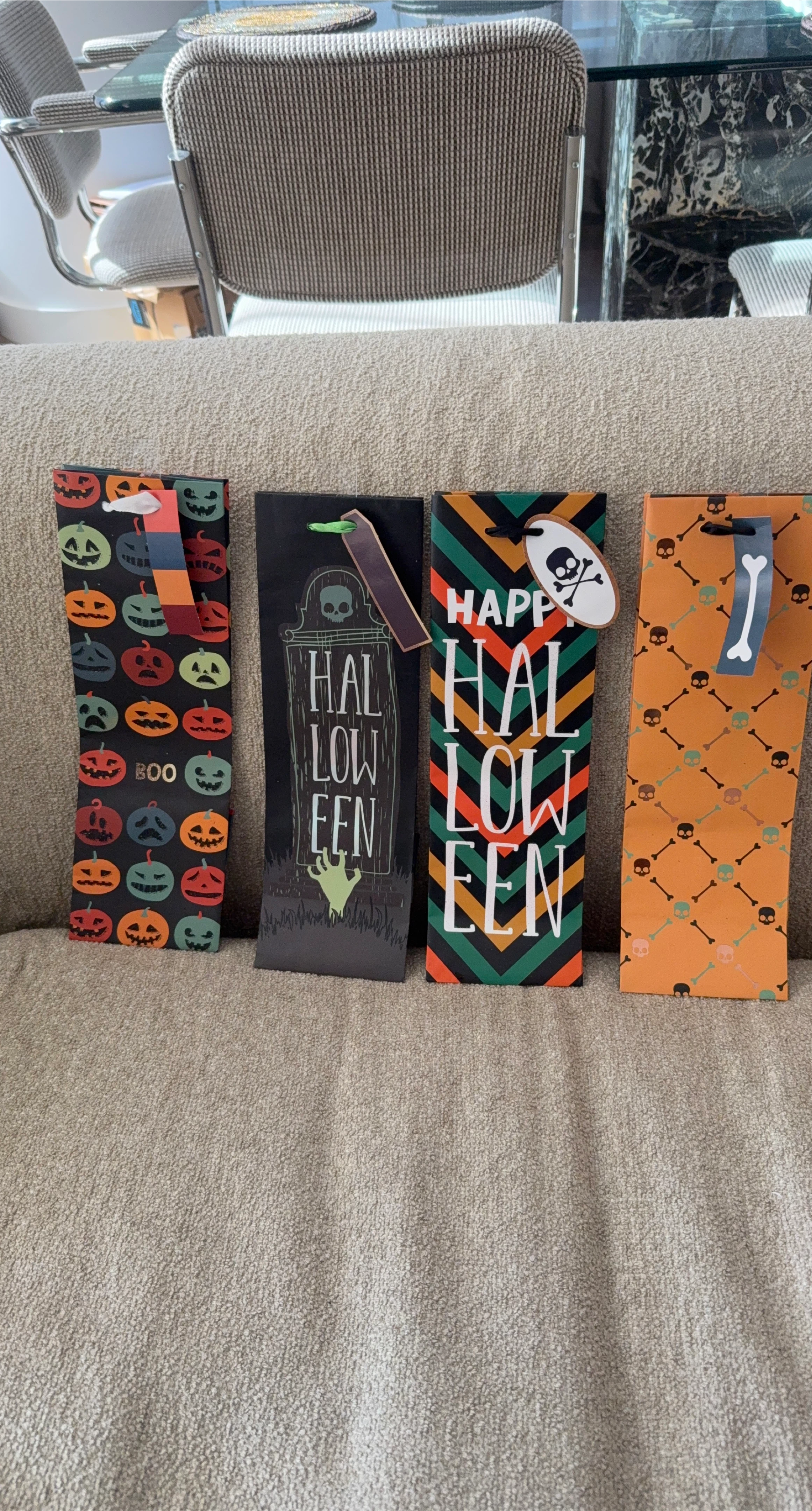 I have a set of 4 Halloween gift bags. They have different designs, including pumpkins, skeletons, and tombstones. Perfect for Halloween treats! I have 6 sets of them available at this time.