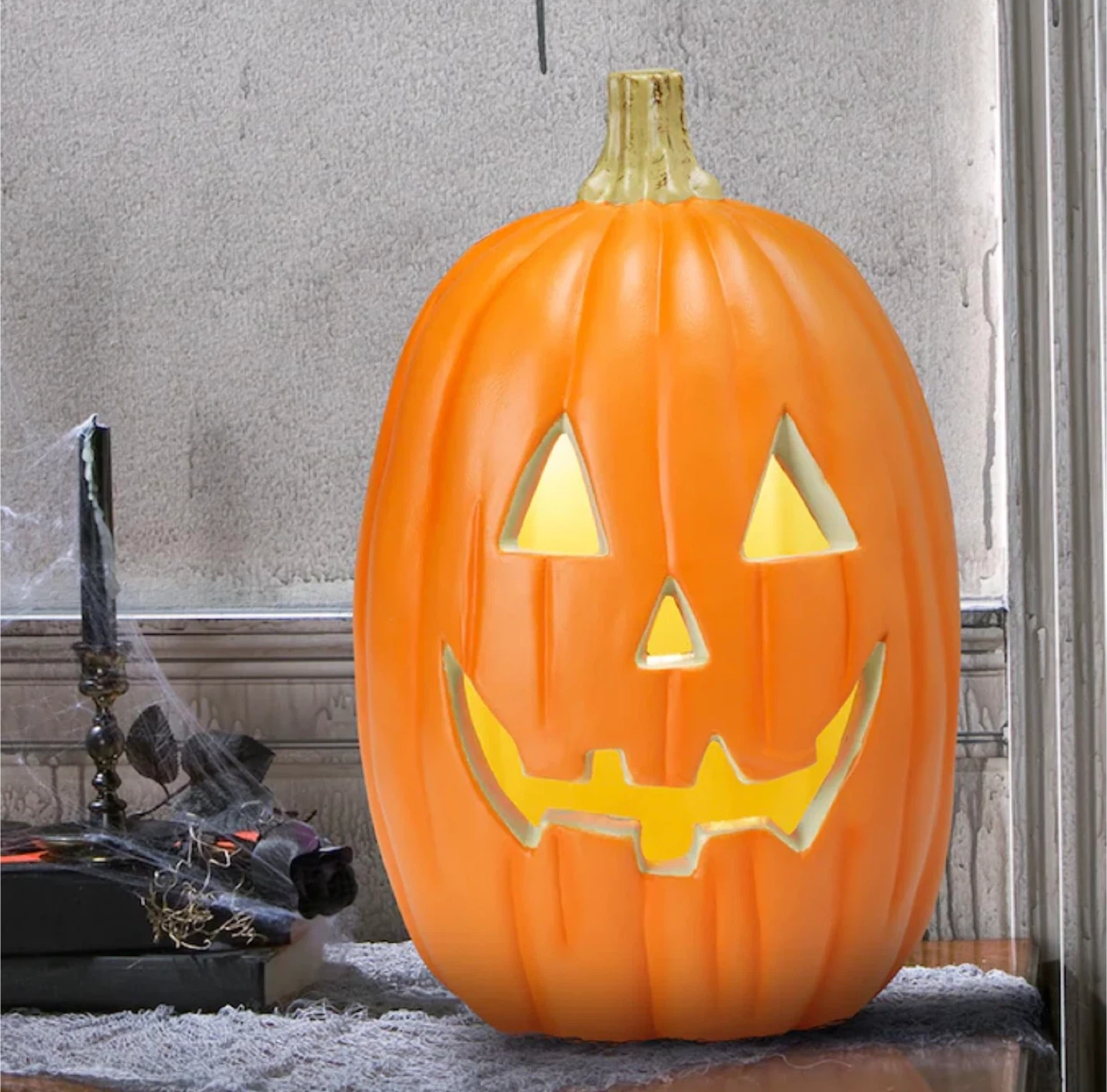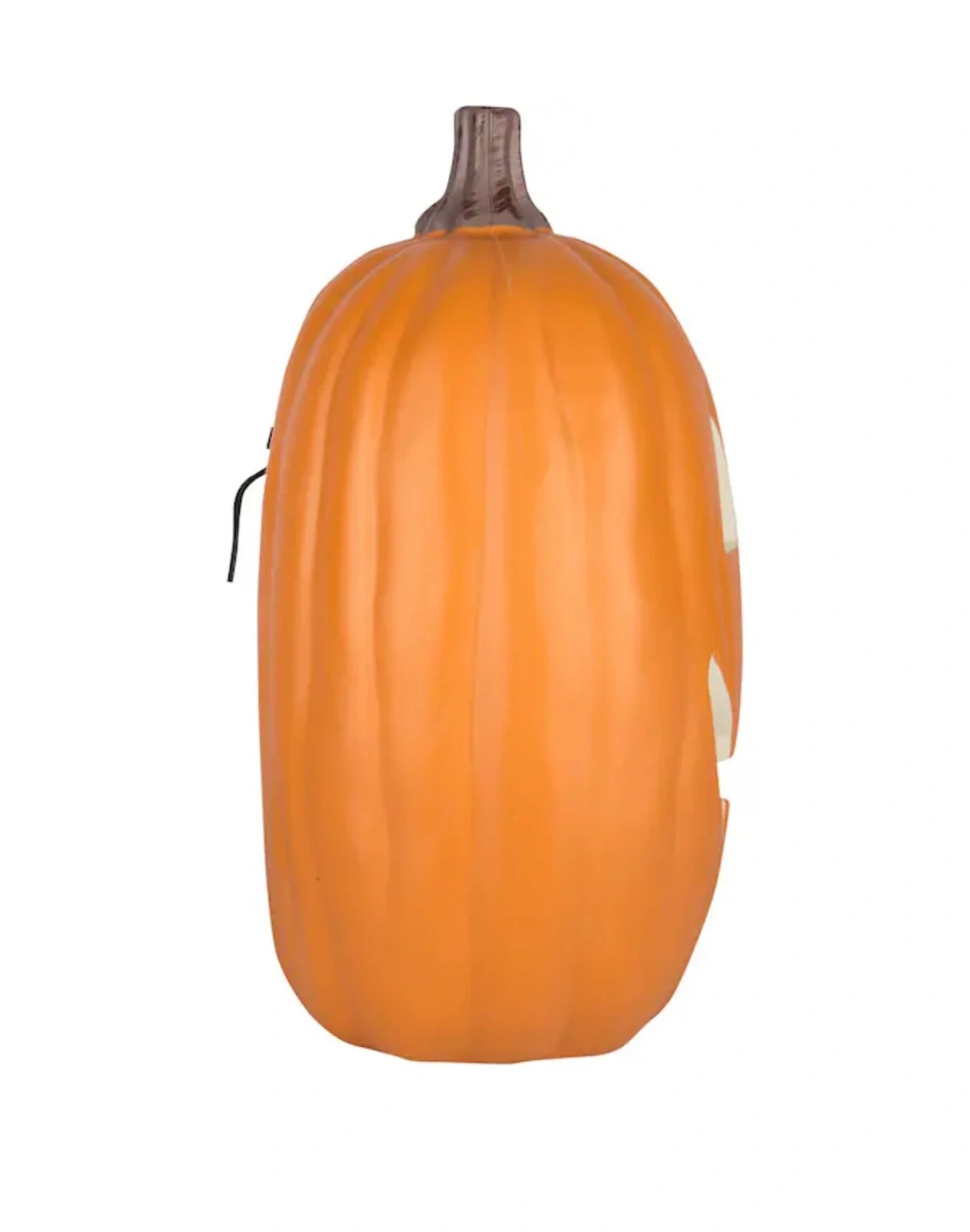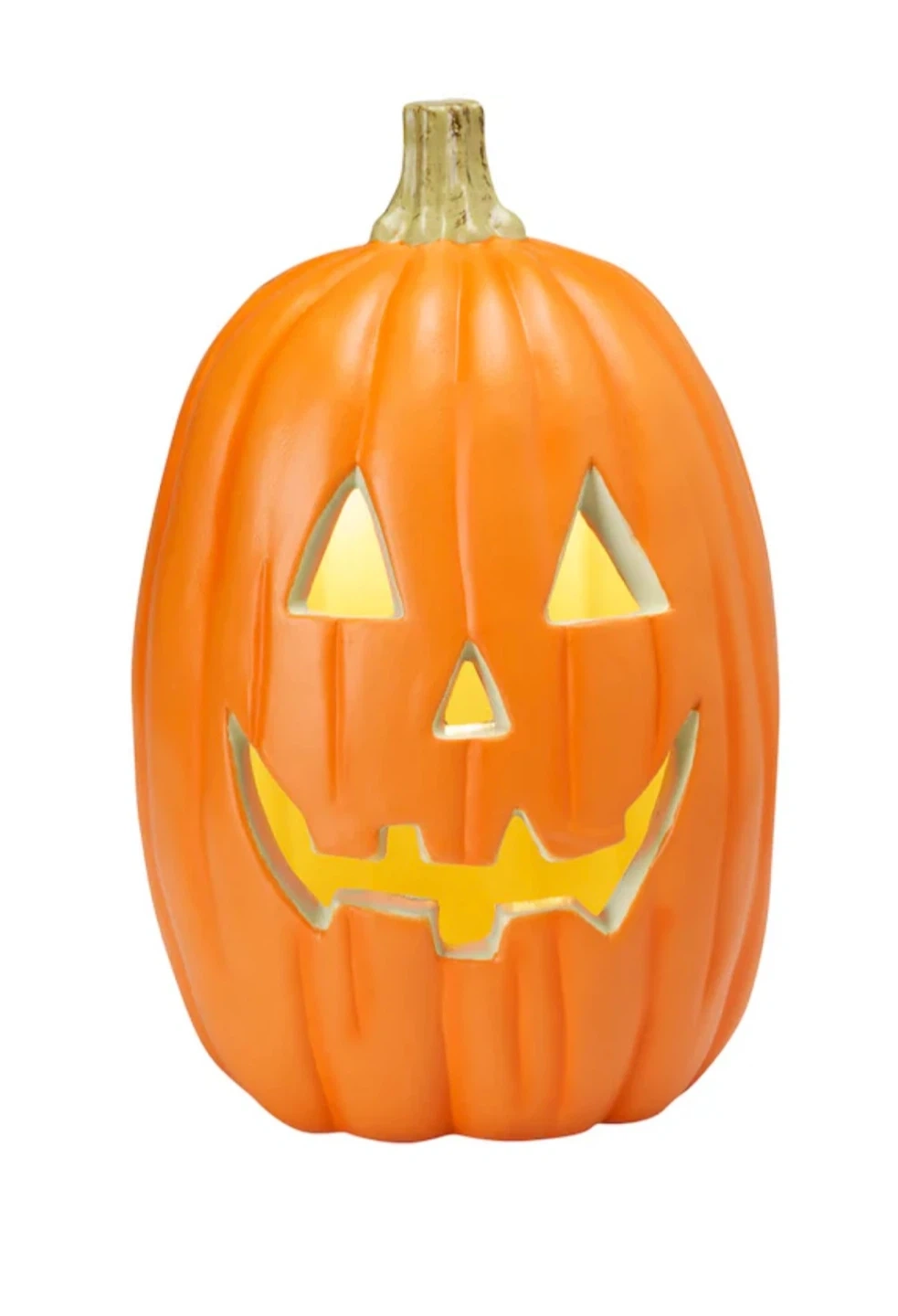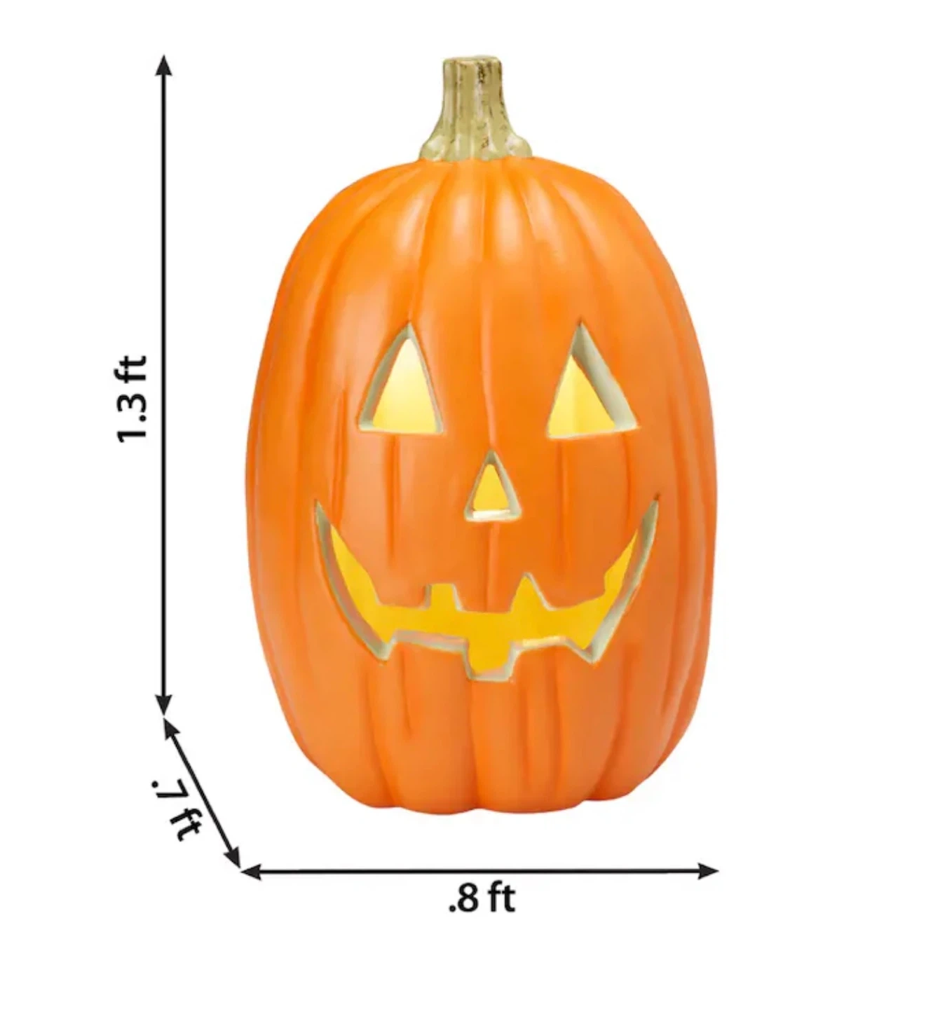 Here's a cute pumpkin decoration, perfect for Halloween! It's lighted and measures 1.3 ft tall, .7 ft wide, and .8 ft deep