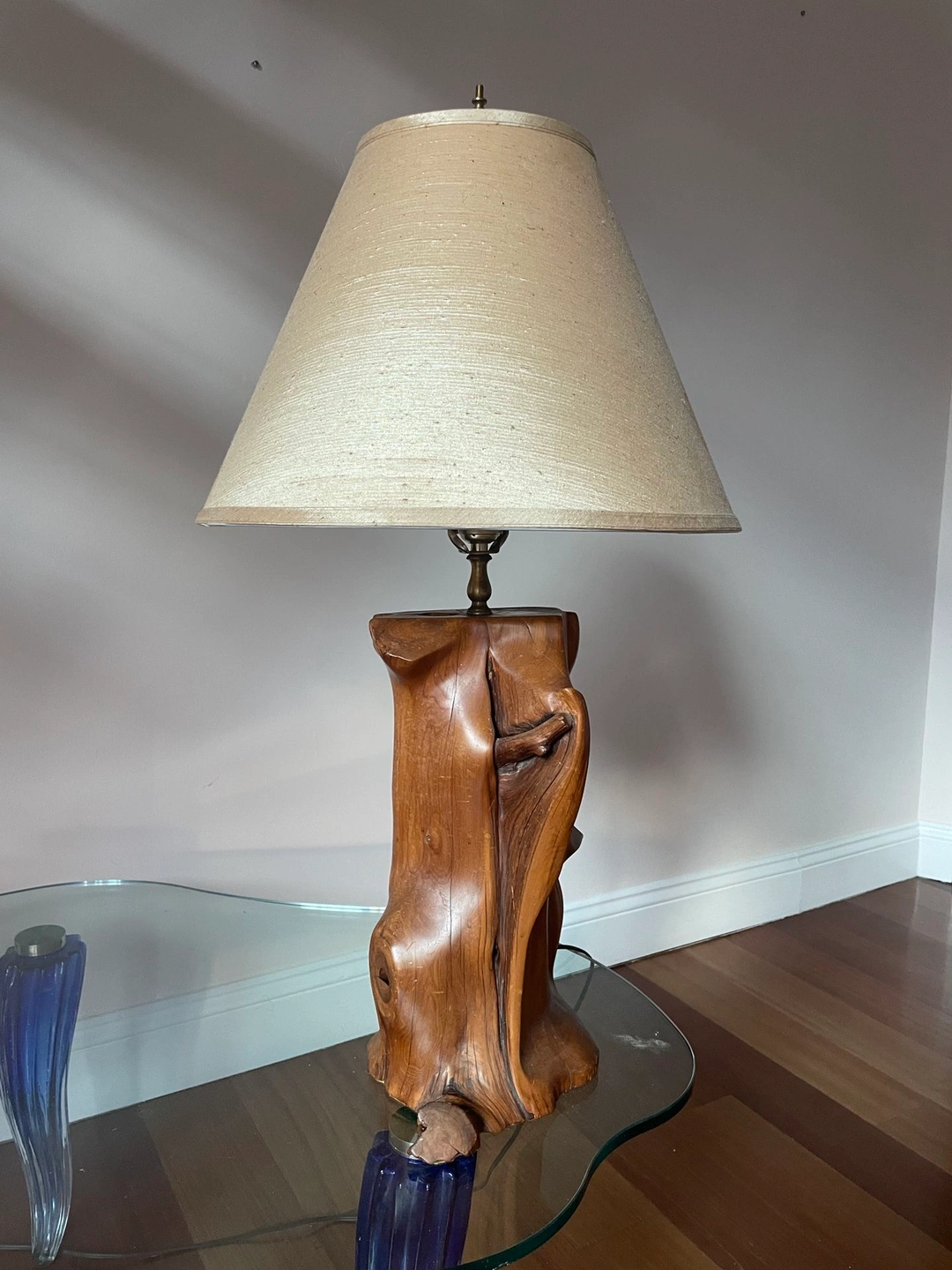 Pieces like this were often made in the mid-century “studio craft” style, and similar natural-form lamps usually sell in the $150–$350 range depending on size and wood quality.