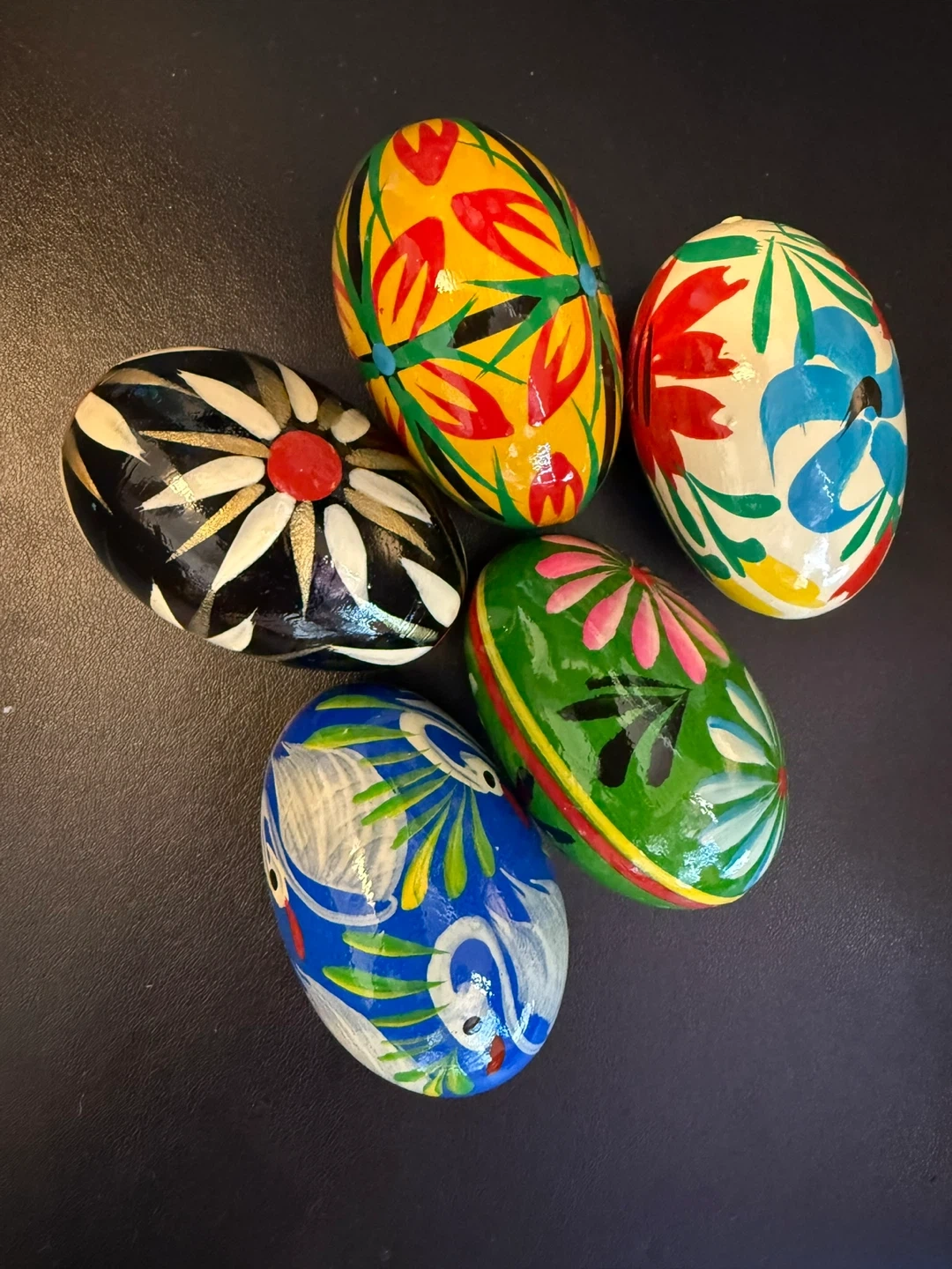 15Selling a set of five hand-painted wooden Easter eggs. Each egg has a unique design and vibrant colors. These are perfect for adding a touch of folk art to your Easter decorations