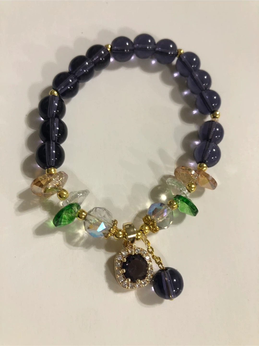 23Selling a handmade beaded bracelet! It features purple beads, colorful crystal-like accents, and a charm.