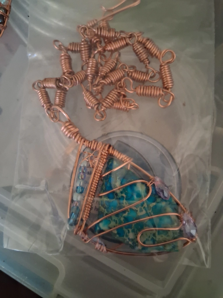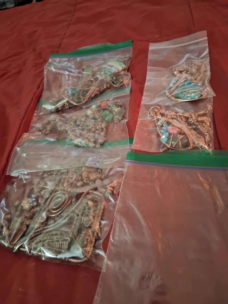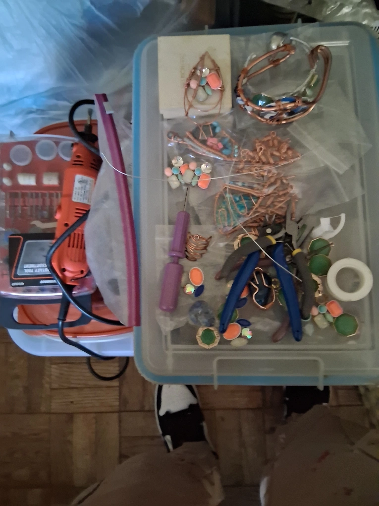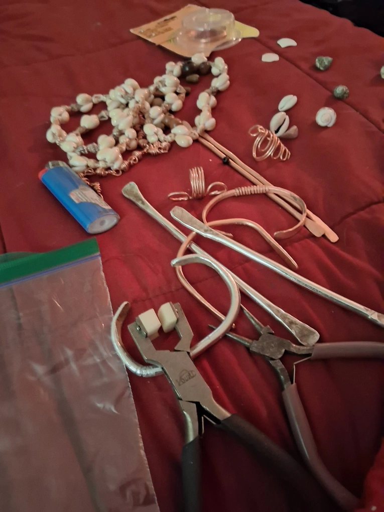 10Selling a collection of handmade copper jewelry and jewelry-making supplies. Includes assorted copper wire pieces, beads, pliers, and other tools. Perfect for jewelry-making enthusiasts!