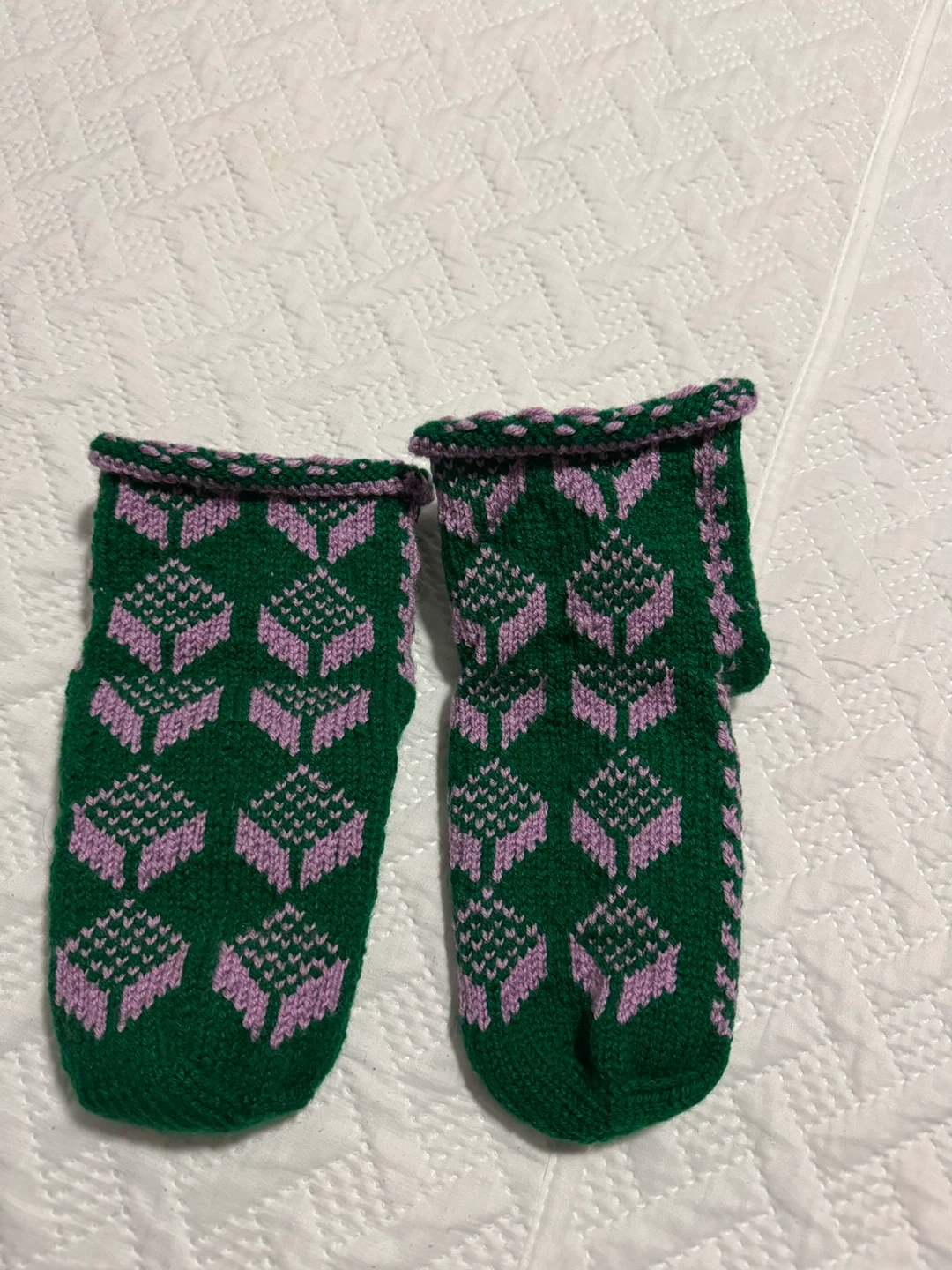 99These are a pair of handmade knitted slippers in green with a lavender pattern. They are soft and cozy, perfect for keeping your feet warm around the house. They appear to be in good condition and ready for a new home!