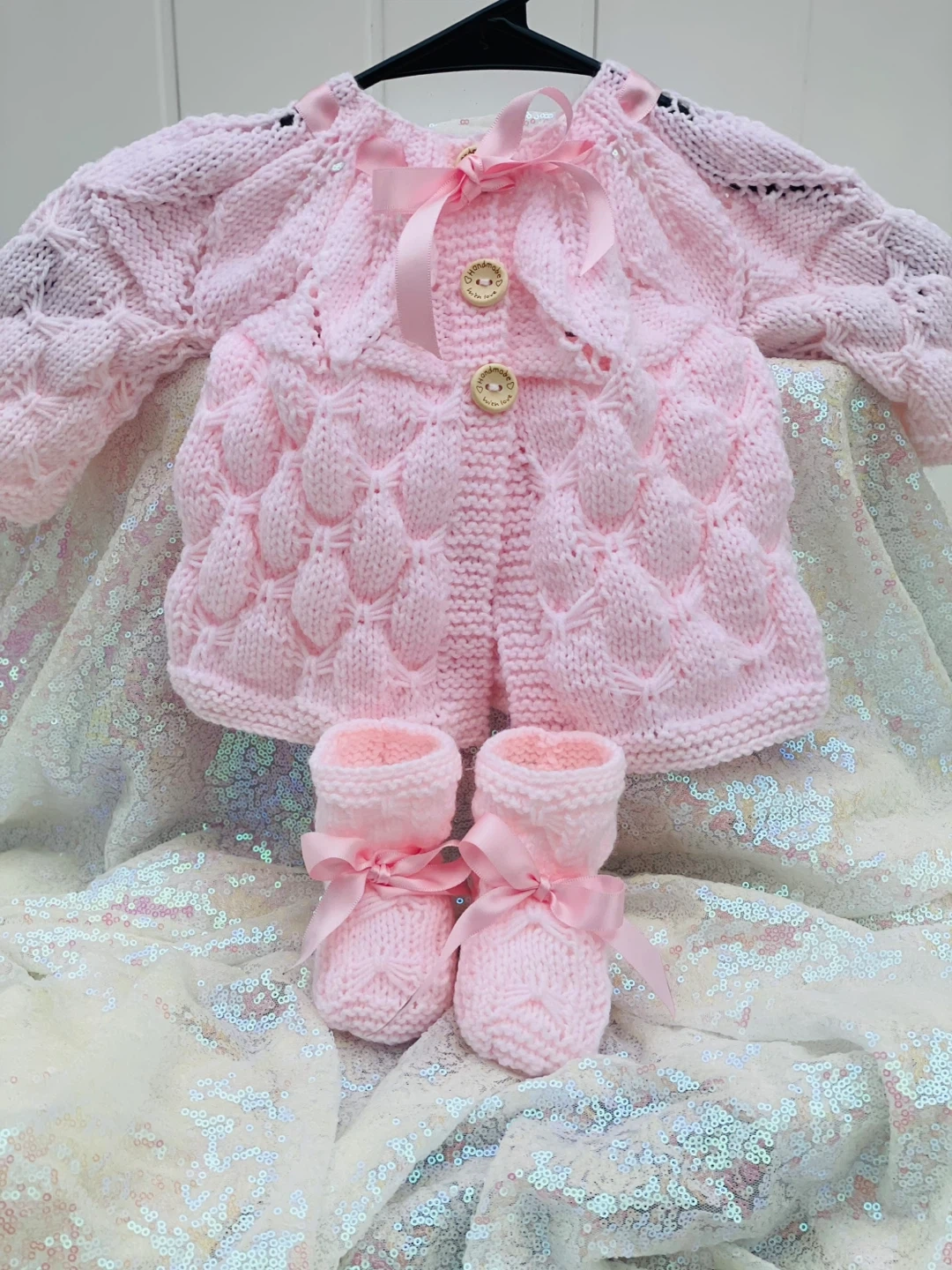 This adorable handmade baby set includes a knitted cardigan and matching booties, all in a sweet shade of pink! The cardigan features cute wooden buttons, and the booties are finished with satin ribbons. Perfect for keeping your little one cozy and stylish!
