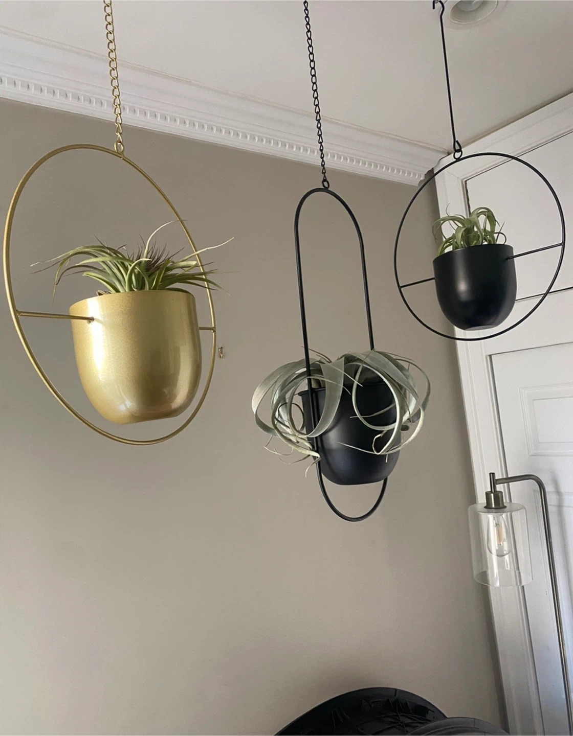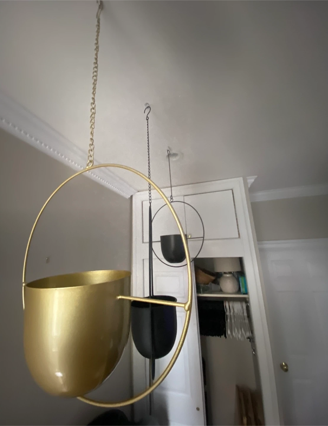 Add a touch of modern elegance to your space with these stylish hanging planters! They come in gold and black, perfect for displaying your favorite plants. They are in great condition and ready to hang!