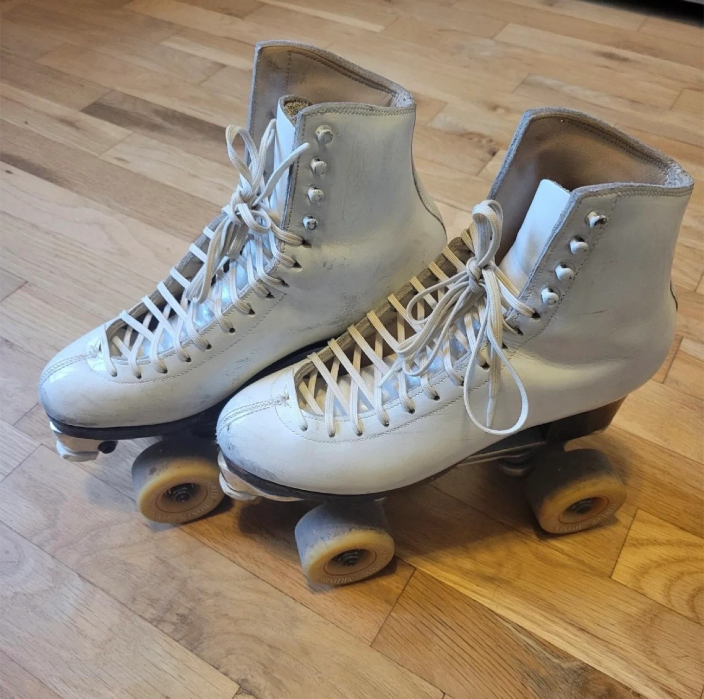 Selling a pair of authentic size 6 Harlick roller figure skates mounted on genuine Douglass Snyder plates with Bones artistic wheels (57mm, 98a) and 7mm bearings.