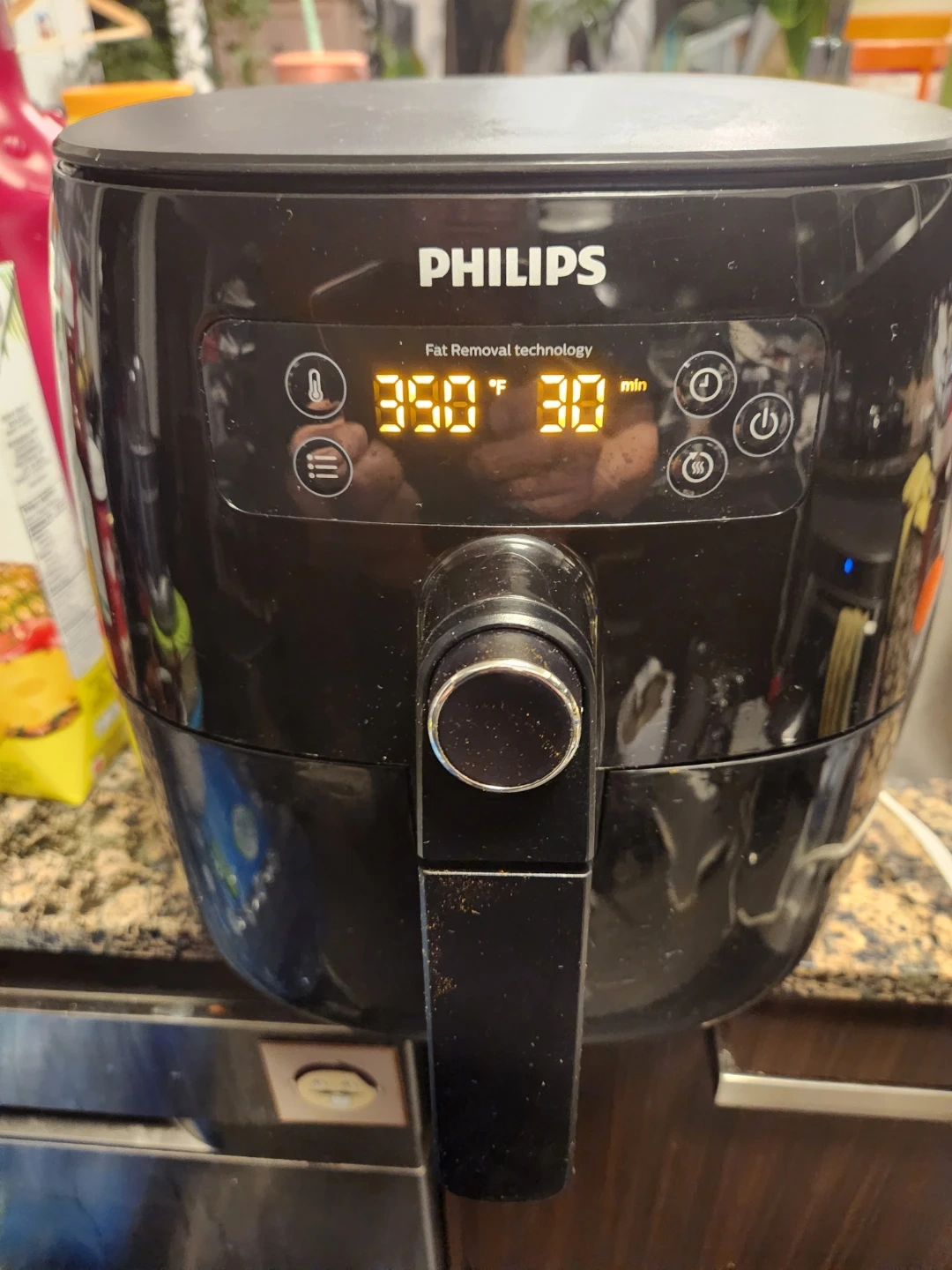 This Philips air fryer features Fat Removal technology. It has a digital display showing 350°F for 30 minutes. It's a black appliance for your kitchen.
