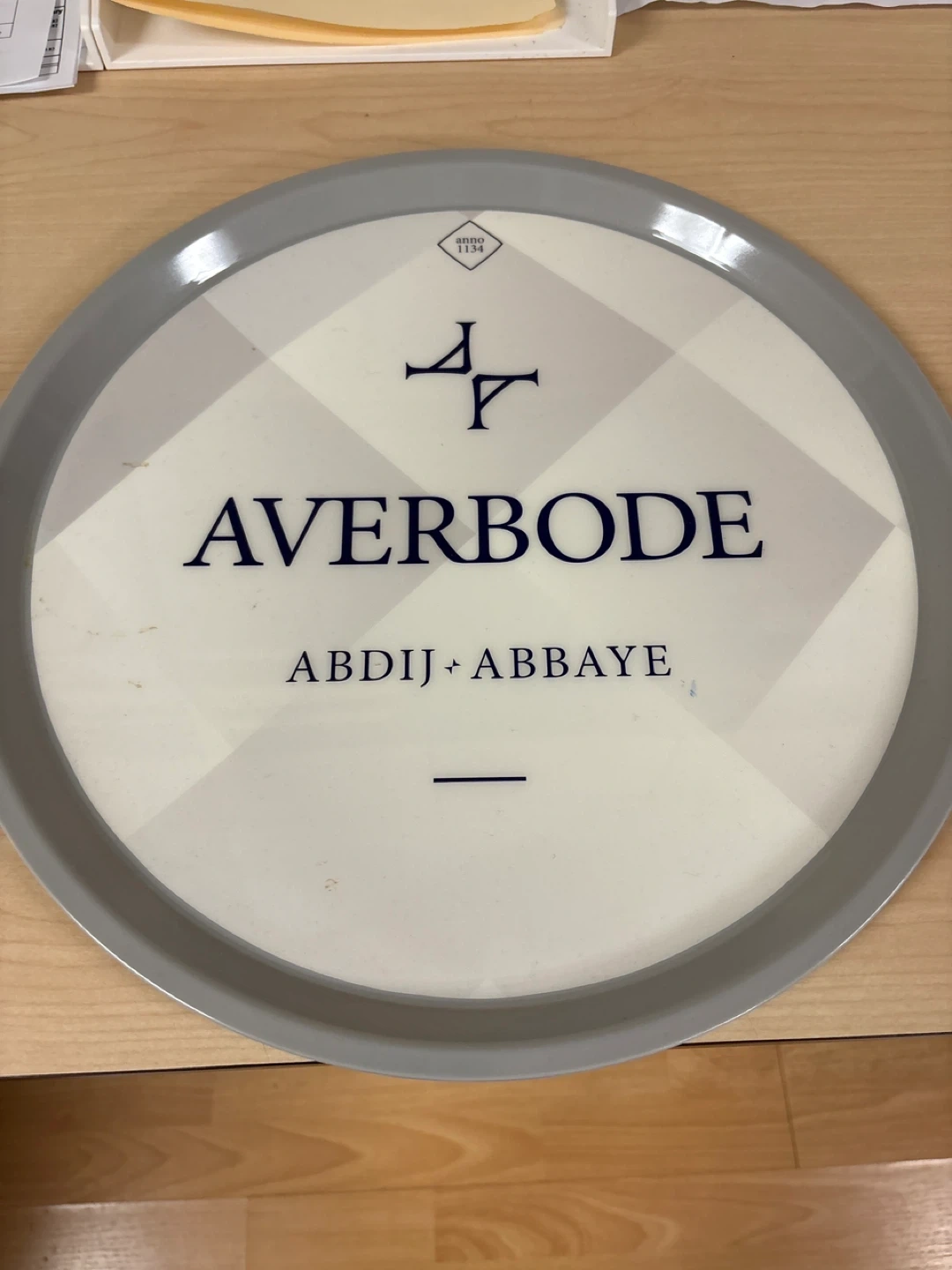Serving tray with Averbode Abdij Abbaye branding. Features a checkered pattern and a grey rim. "Anno 1134" is also visible.
