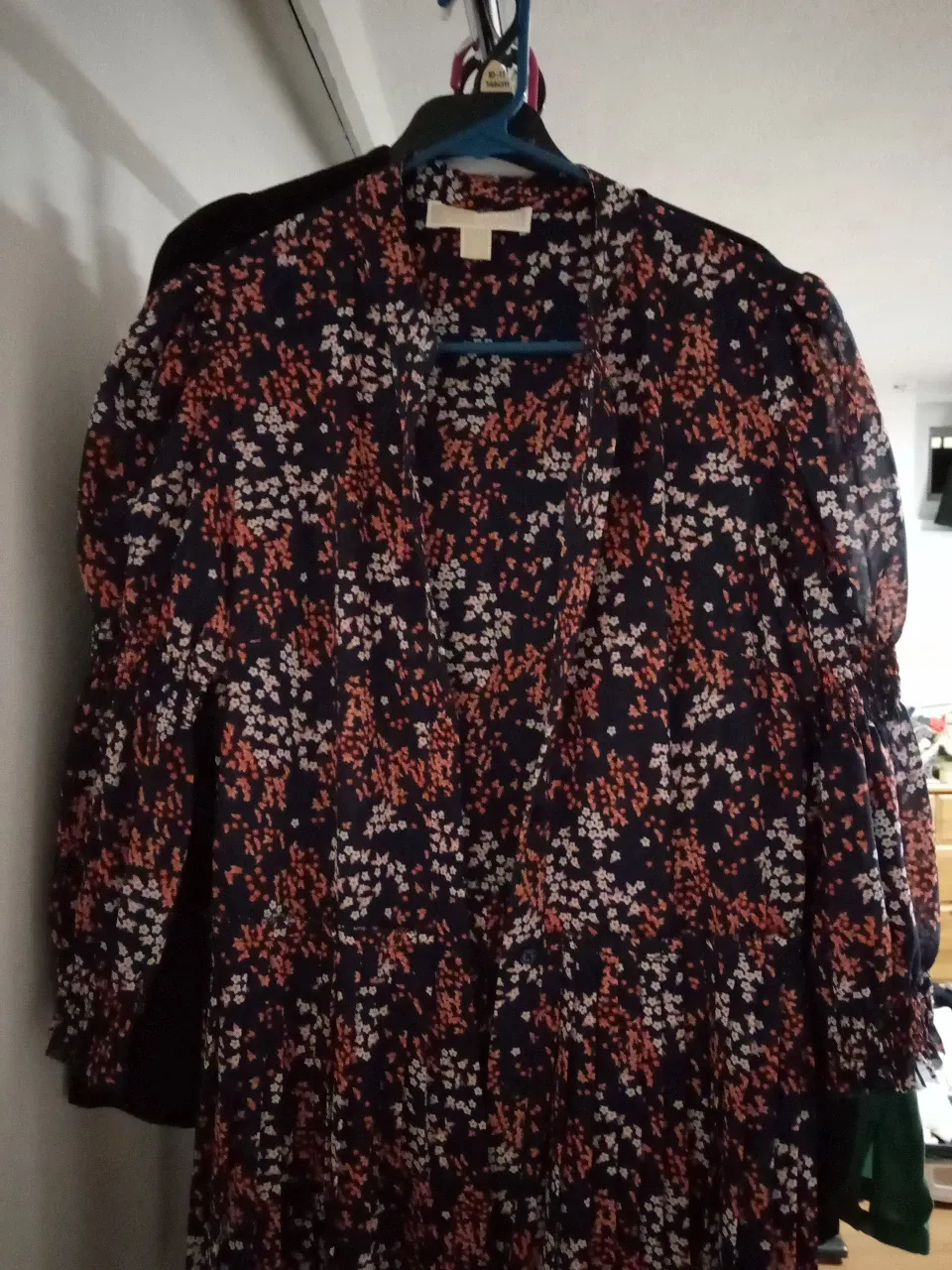 This is a Michael Kors women's dress with a navy blue base and a multicolor floral print. It features a V-neckline and long sleeves with gathered cuffs. The dress is made from a lightweight, flowy material.