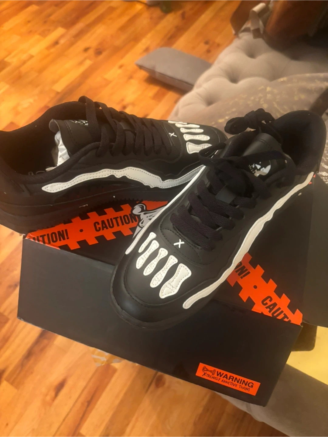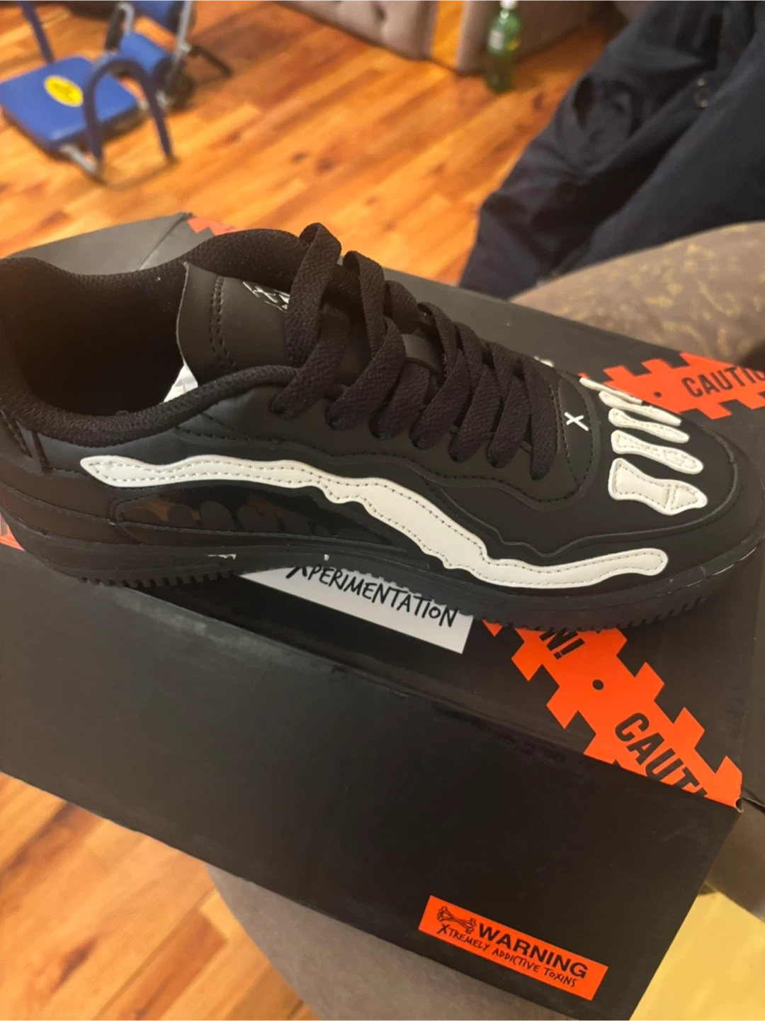 These black sneakers feature a unique white skeleton bone design. They come with a "caution" tape-style box. The shoes have black laces and a durable sole. Perfect for making a statement!