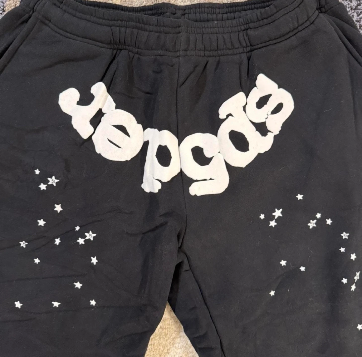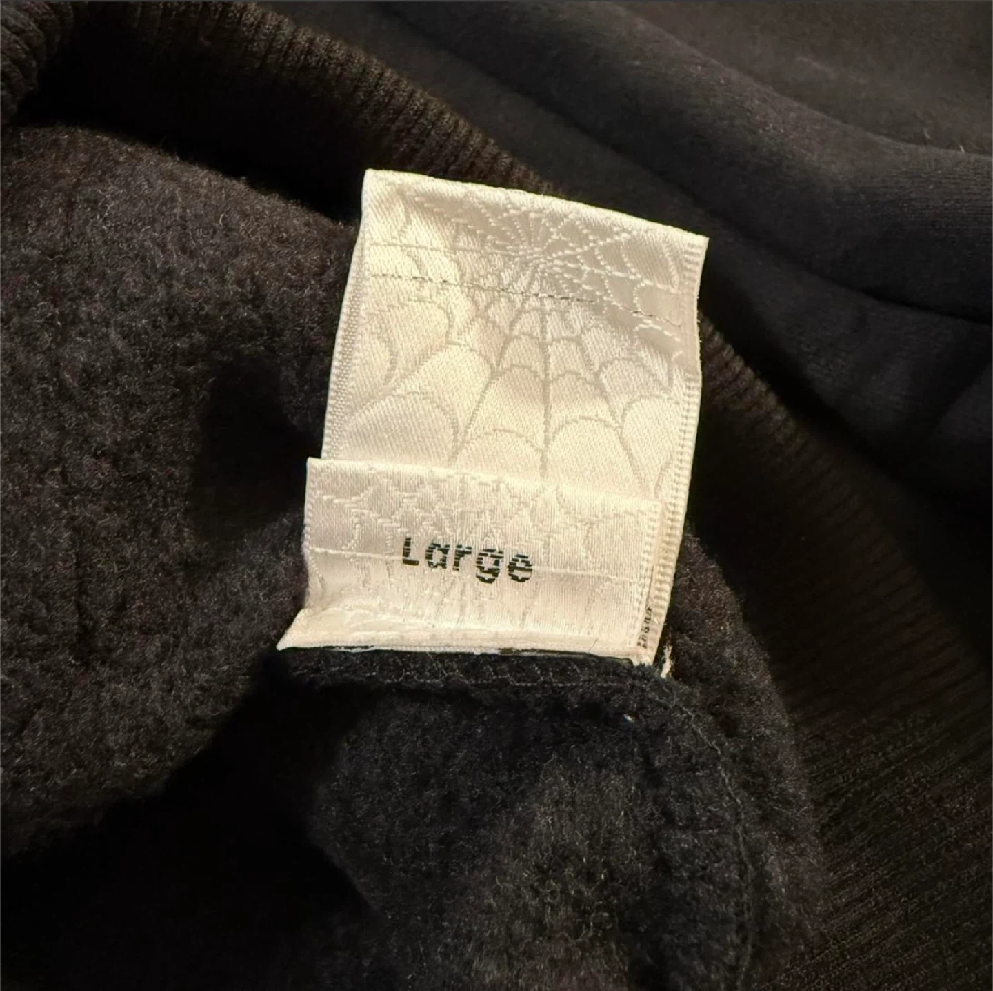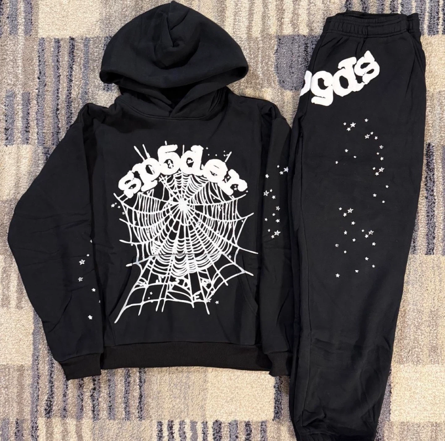 This is a black Spider Worldwide sweatpants and hoodie set. It's size large and features a graphic spiderweb design on the front of the hoodie and scattered stars on the sweatpants. The hoodie also has "sp5der" lettering on the back.