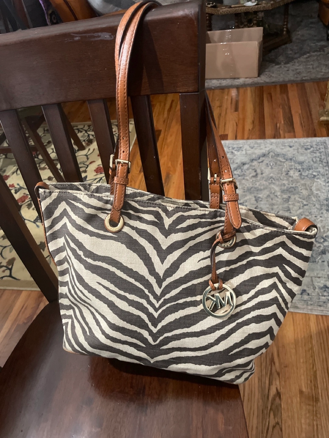 This Michael Kors tote bag features a zebra print canvas exterior with brown leather trim and straps. It has a gold-tone MK logo charm. The bag's material is canvas and leather.