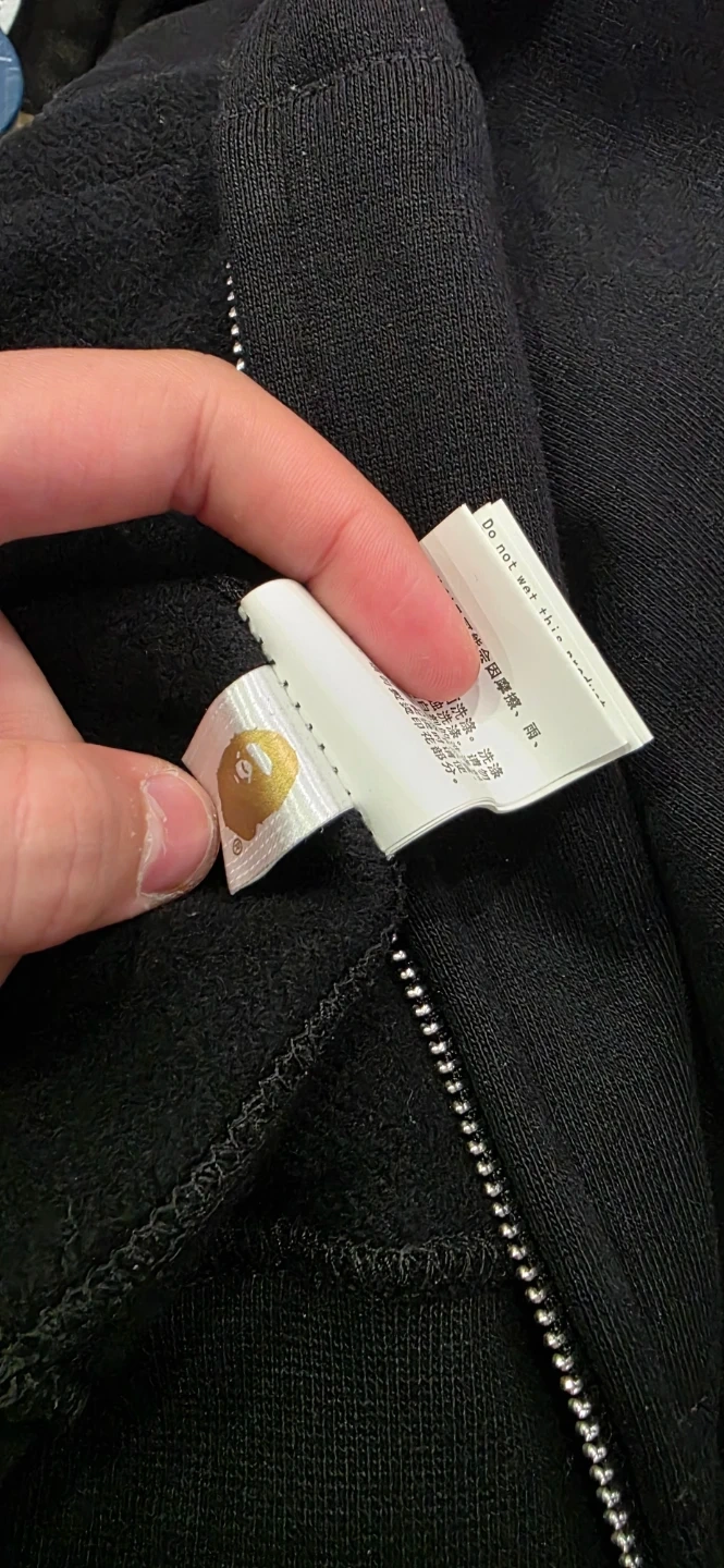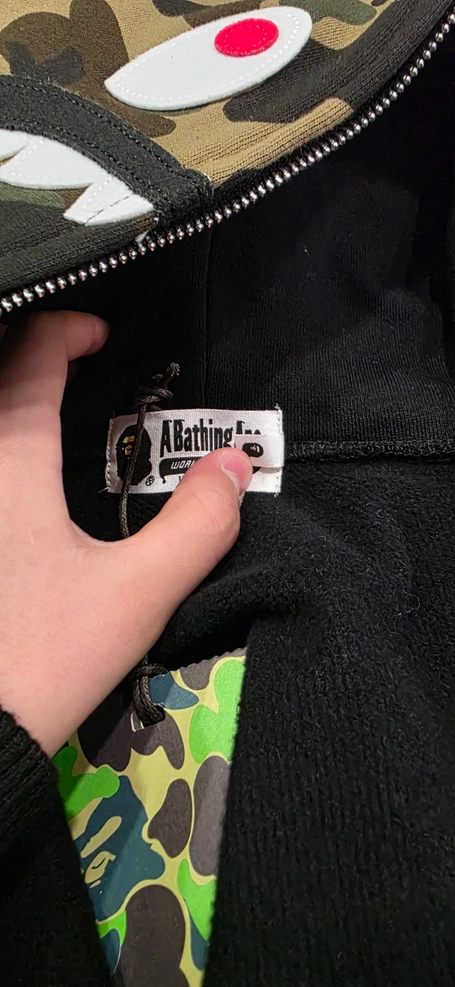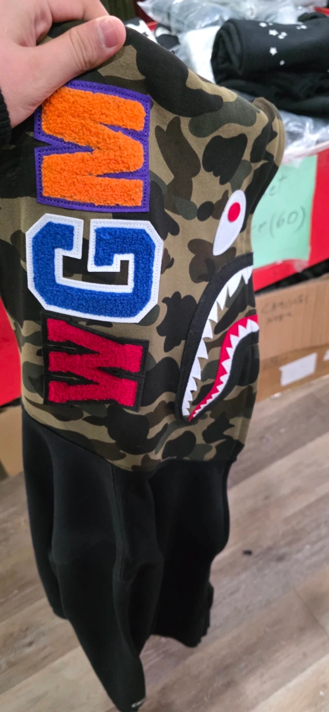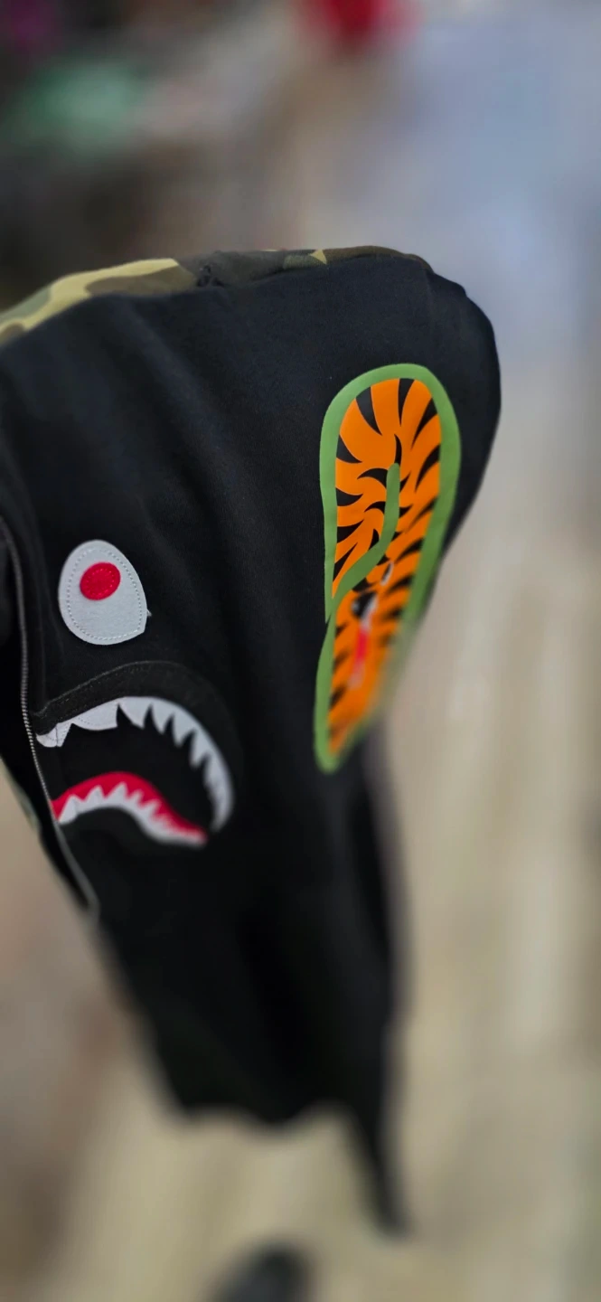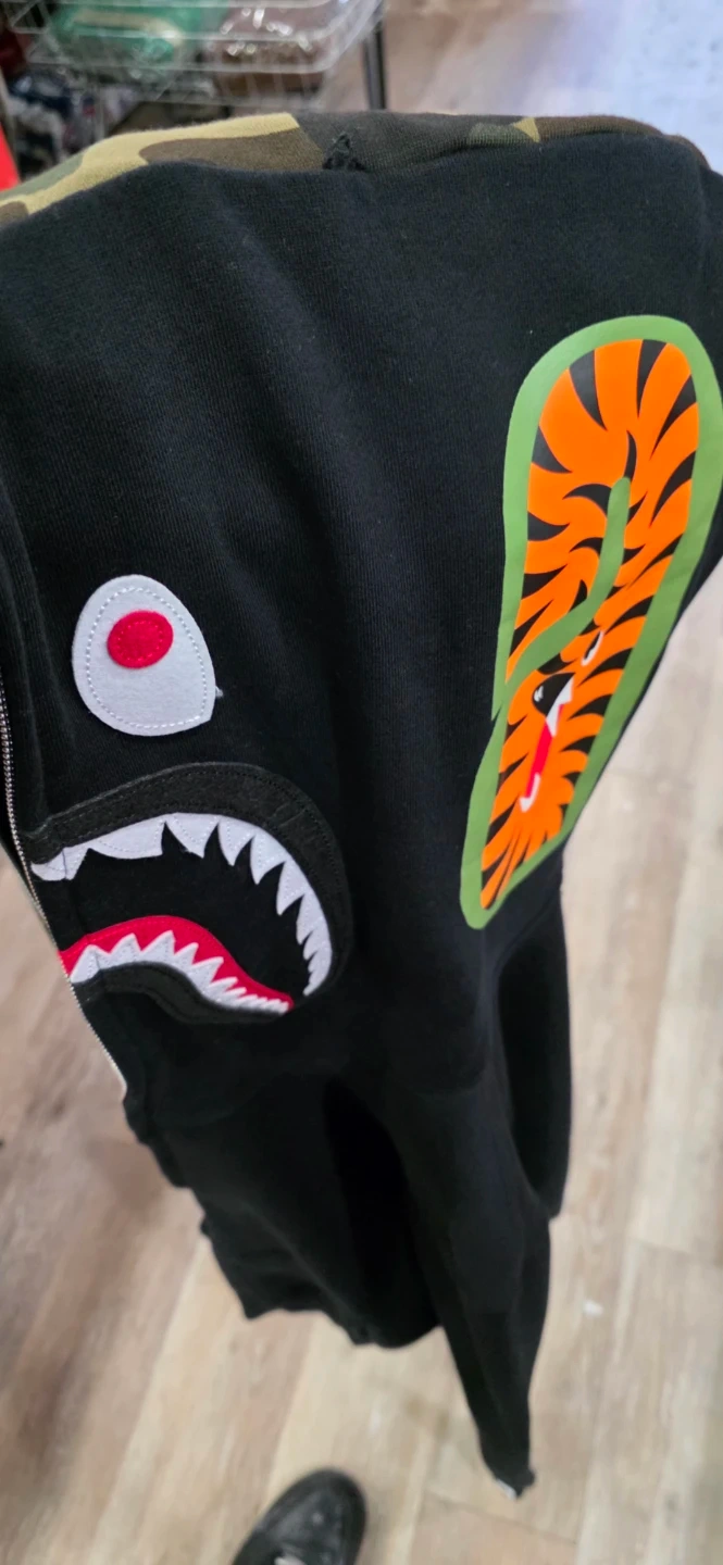 This A Bathing Ape hoodie features the iconic shark graphic on the front and a camouflage pattern on the hood. It's made of comfortable fabric, perfect for everyday wear. It comes with tags attached.