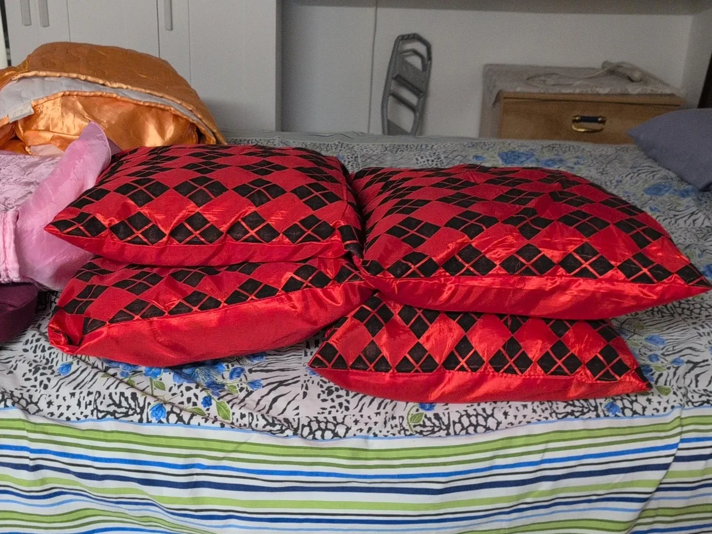 This set includes four decorative throw pillows. They feature a striking red and black diamond pattern, adding a bold accent to any room. Pillow covers appear to be a satin-like material. 20 dollars for four
