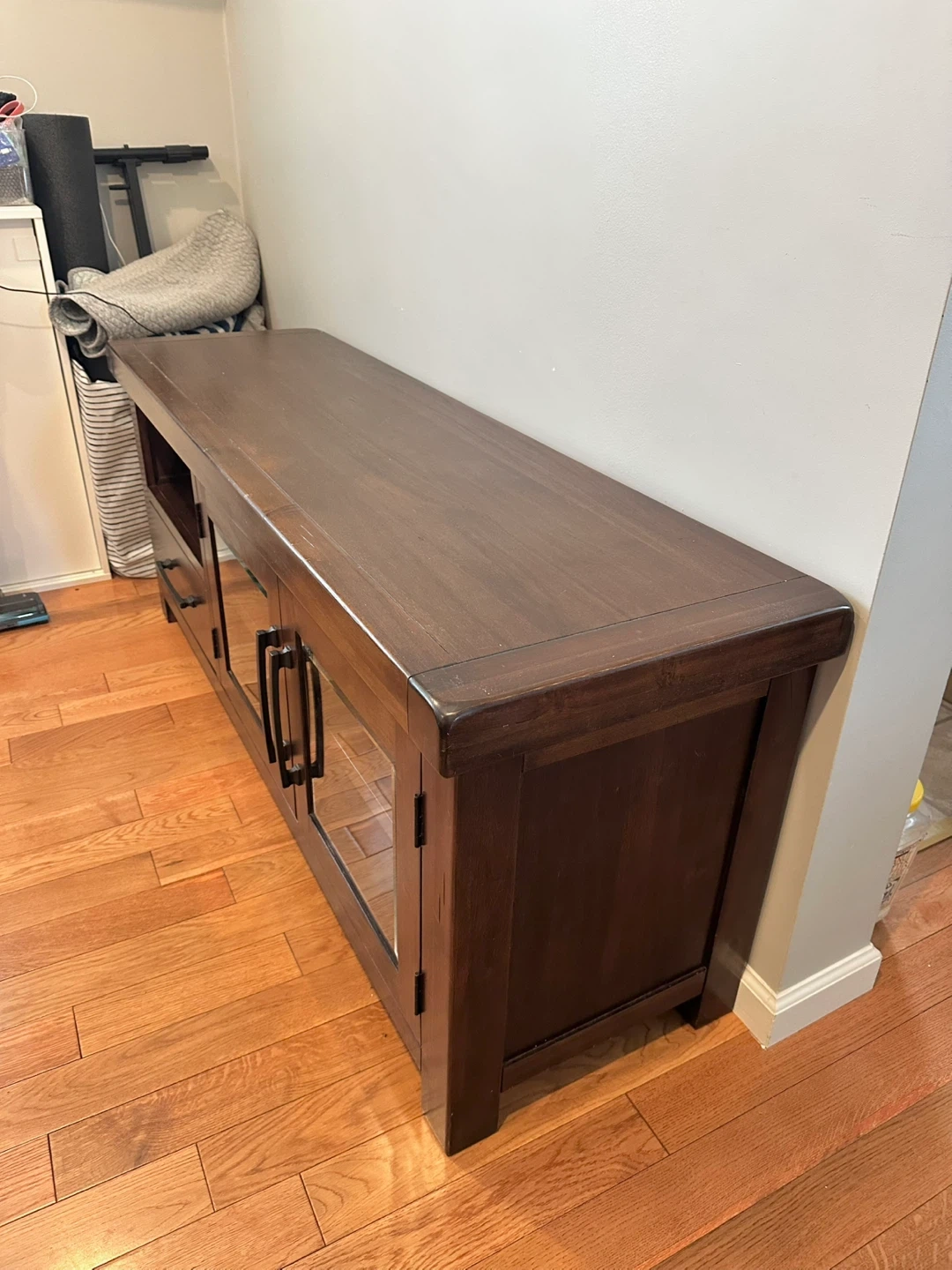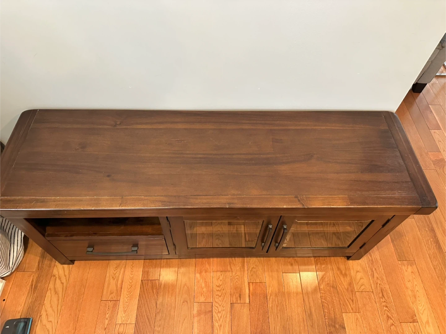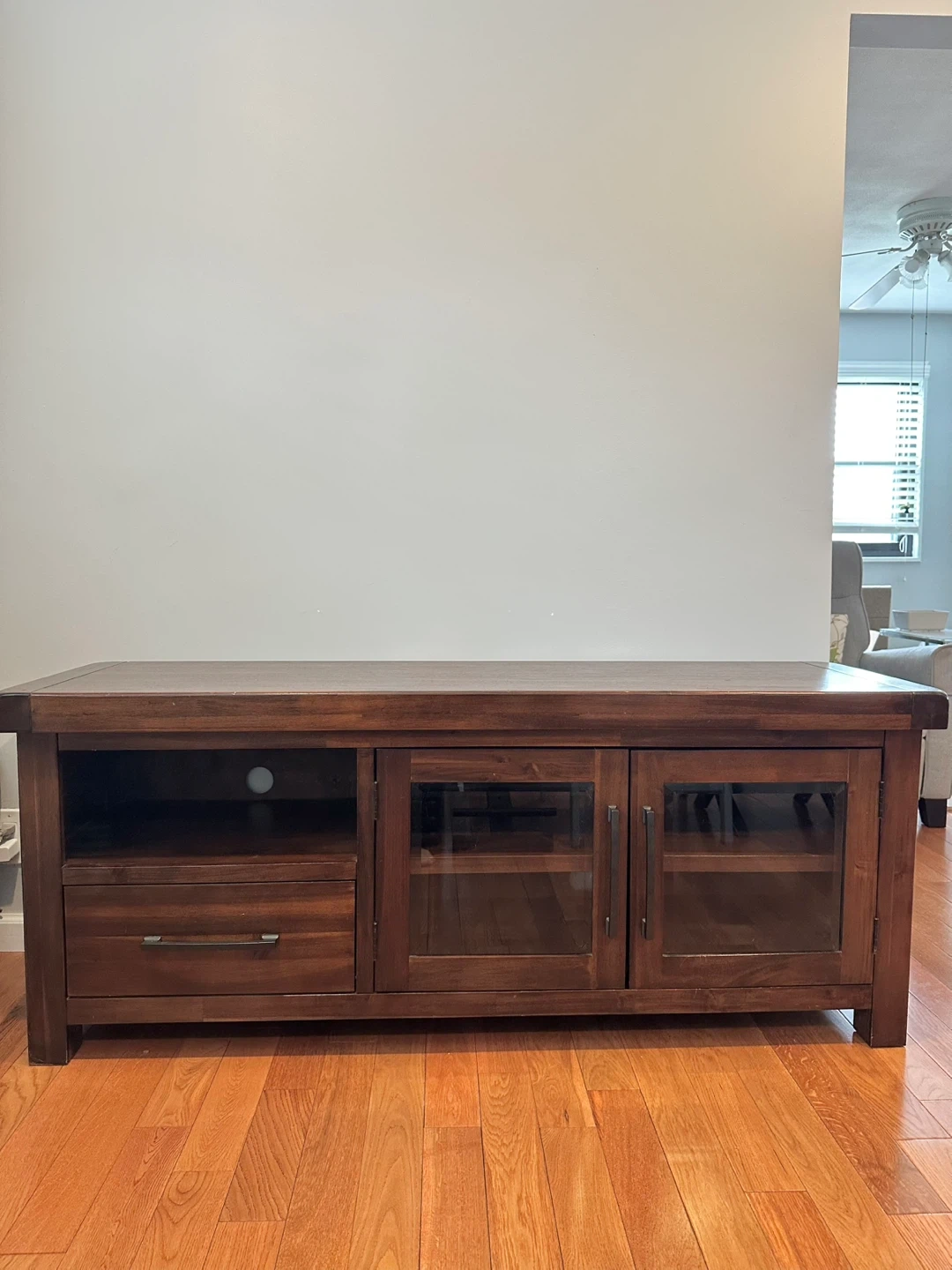 This dark wood media console offers ample storage. It features a drawer and two cabinets with glass doors. Its simple design complements various living room styles.