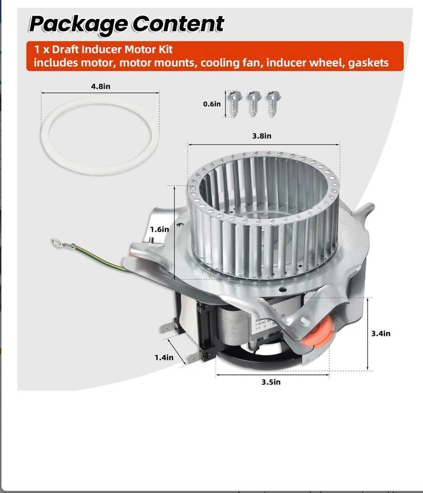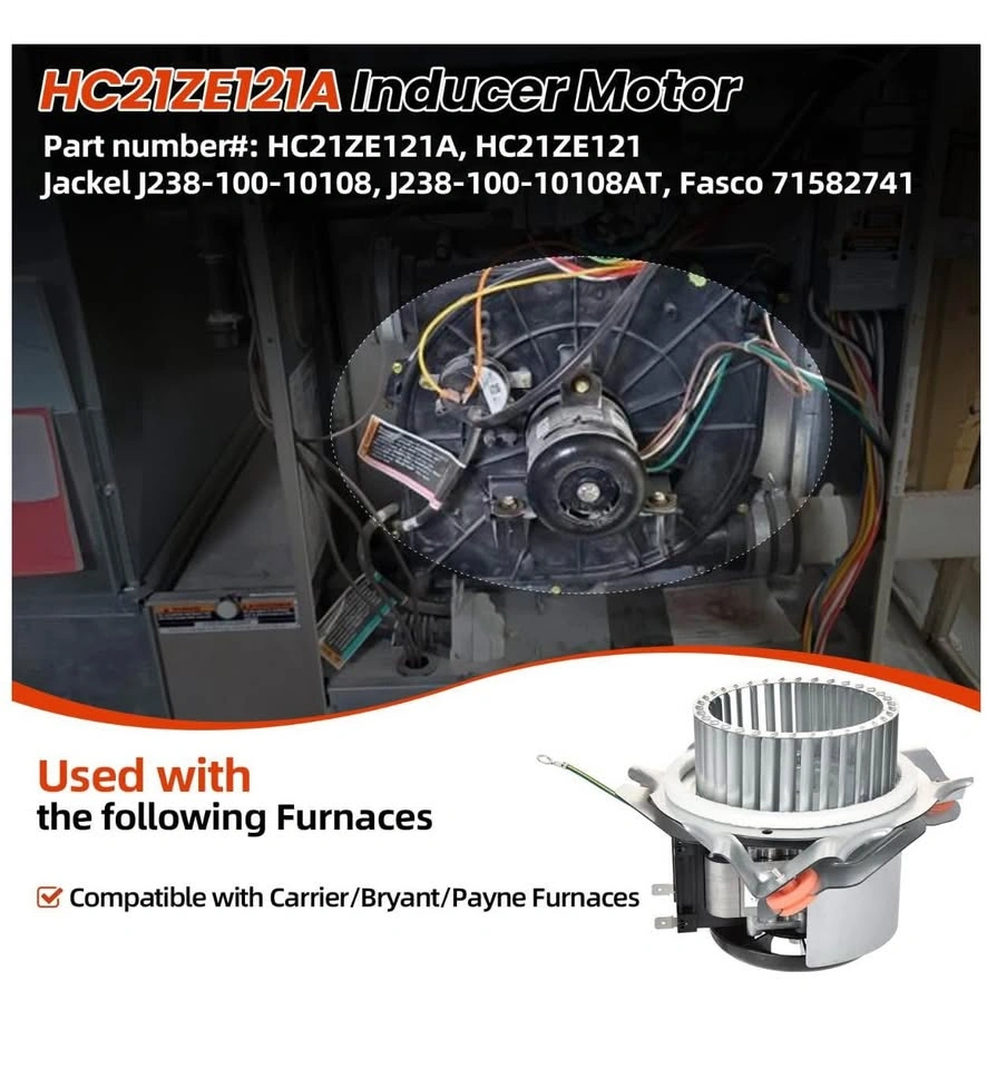 Replacement Part Number: HC21ZE121A, HC21ZE121, Jackel J[hidden information], J[hidden information]AT, Fasco 71582741 Compatible with Carrier, Bryant, Payne Furnaces Specifications: Voltage: 115V; Amperage: 0.9A; Frequency: 60 HZ; Speed:3000 RPM, Class H; Condition: New This furnace e-xhaust draft inducer motor is made from motor-specific silicon steel and premium enameled copper wire and is manufactured to OE specifications for direct installation without modification. Perfect replacement for old inducer motors You will get 1 x draft inducer motor kit(includes motor, motor mounts, cooling fan, inducer wheel, gaskets).
