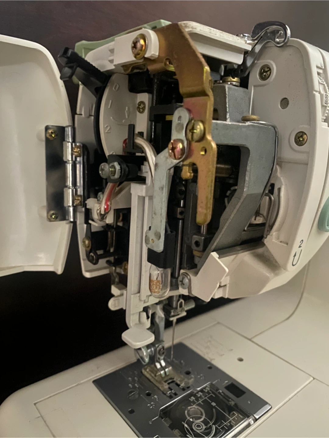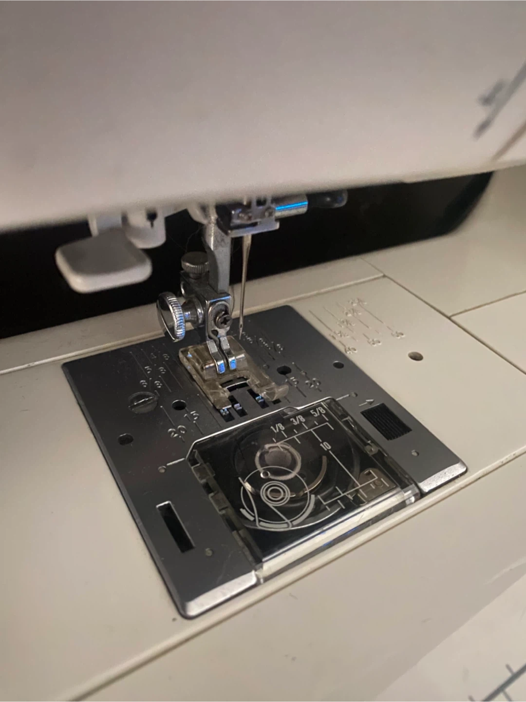 Clear presser foot left tip is broken but still workable & machine will come with other feet options. Really easy threading & bobbin loading!