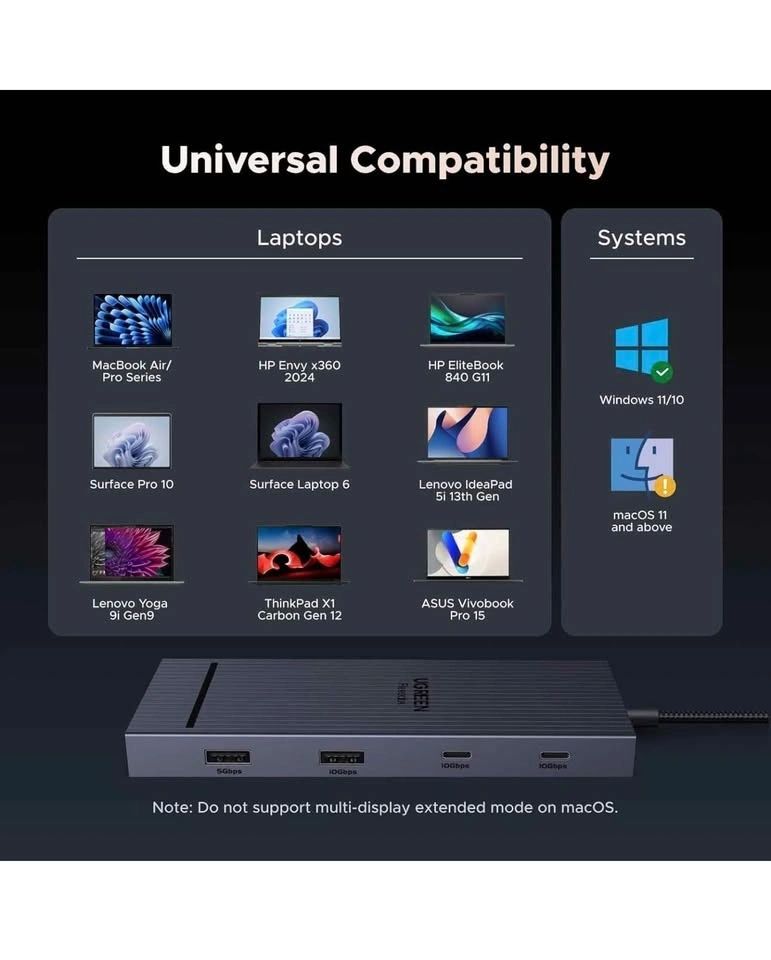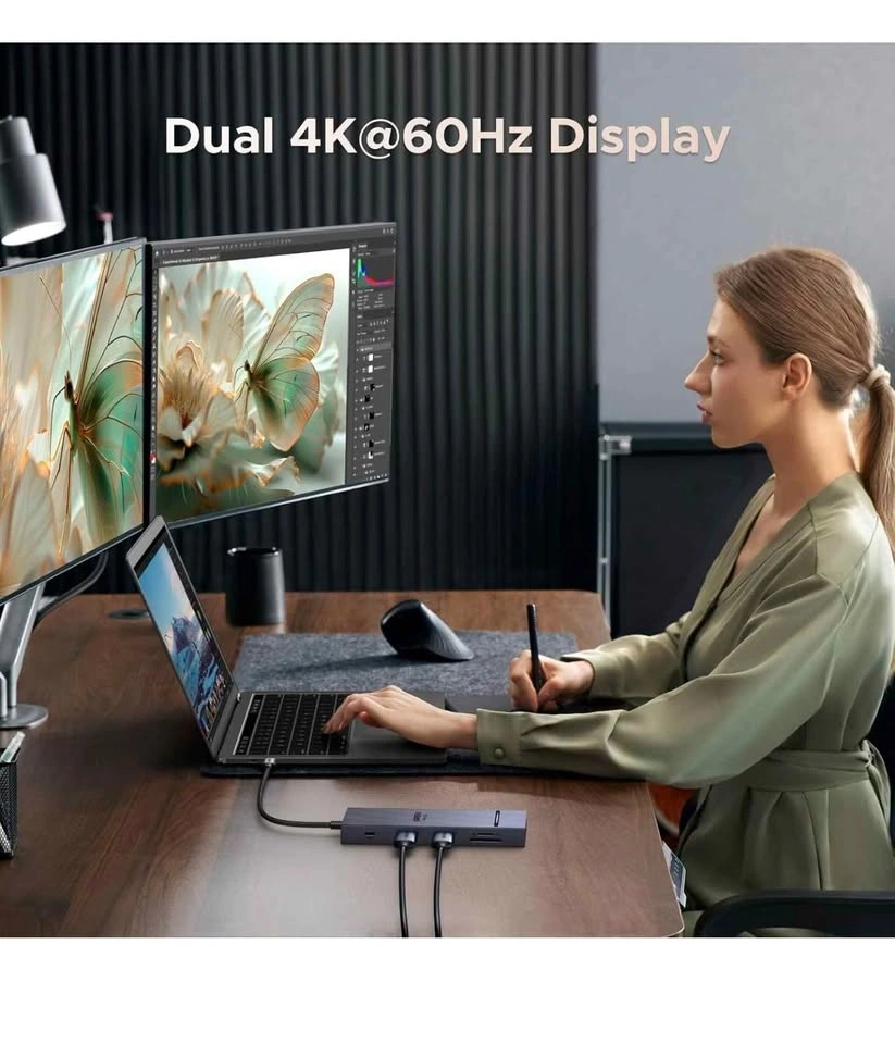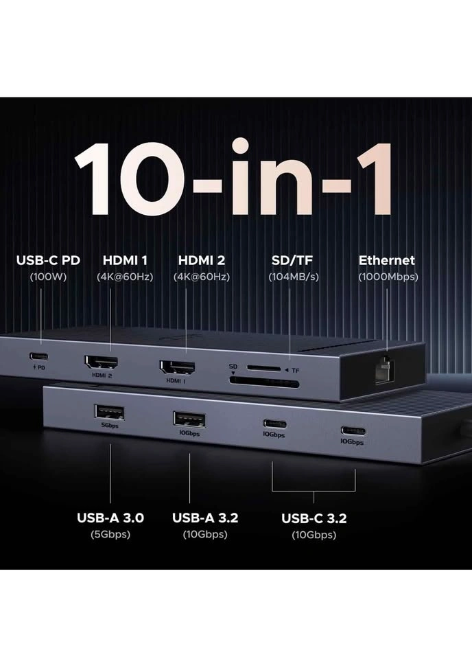 Versatile UGREEN Revodok 10-in-1 USB-C docking station. Has USB-C PD 100W for charging your laptop. Comes with dual 4K@60Hz HDMI ports for monitors. Also has SD and TF card slots, plus a gigabit Ethernet port for fast internet. Lots of USB ports too: USB-A 3.0 (5Gbps), two USB-A 3.2 (10Gbps), and a USB-C 3.2 (10Gbps) port. Great for expanding your laptop's connectivity, brand new.