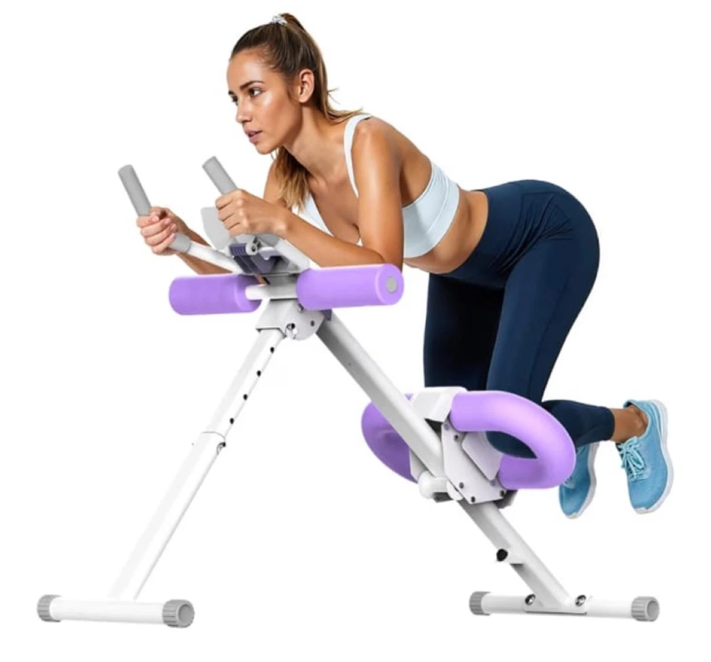 This is an abdominal exercise machine in white and purple. It's designed for core workouts. The machine includes padded handles and leg supports for comfort.