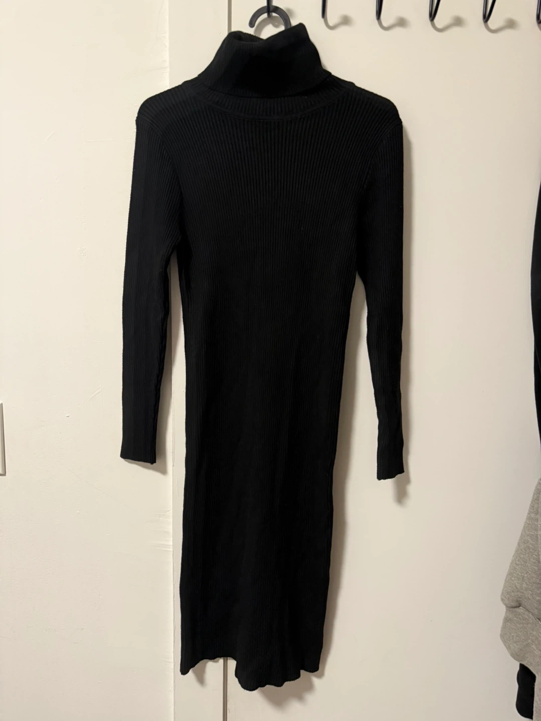 Selling a black turtleneck ribbed dress. It's a stylish and comfortable piece for any wardrobe. The dress is in great condition and ready for a new home!
