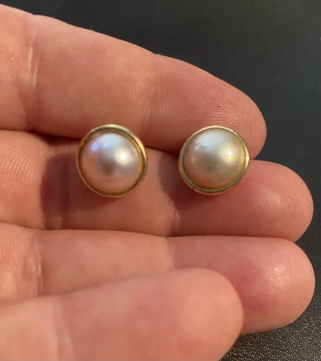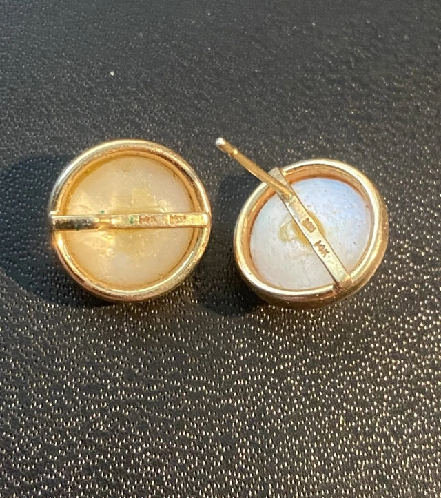 These are some lovely, used 14K gold earrings, each featuring a classic pearl, perfect for adding a touch of elegance to any outfit. While they show some signs of wear, they still hold a timeless appeal.