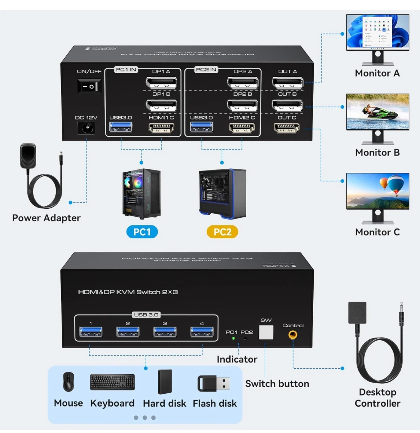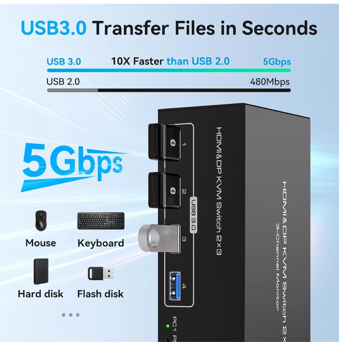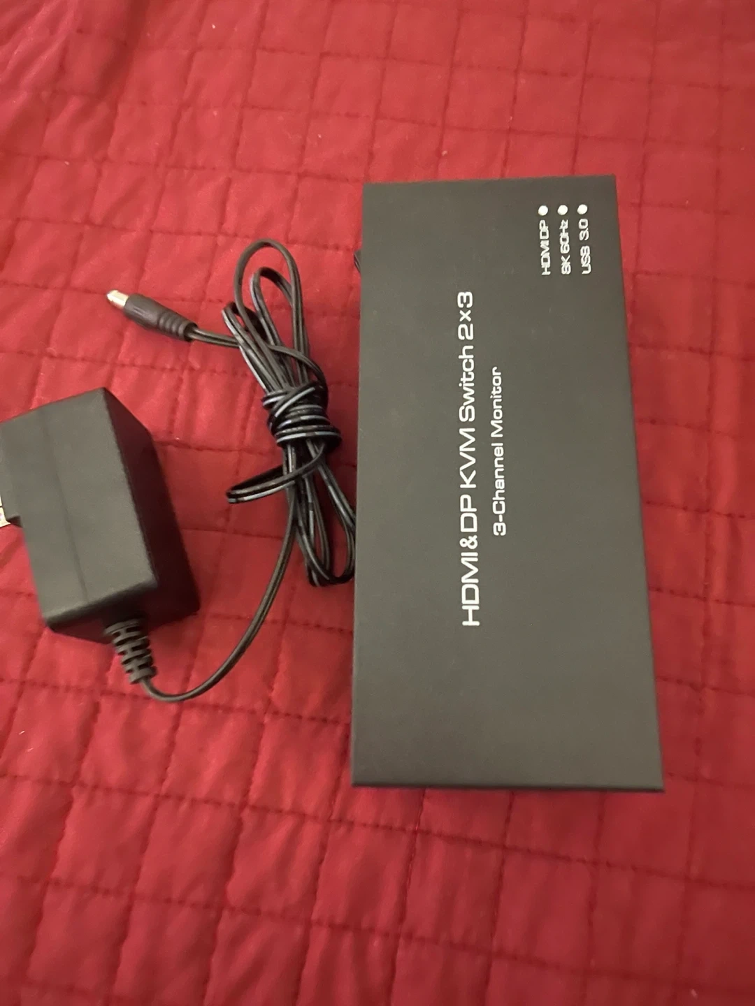 Selling a HDMI&DP KVM Switch 2x3 for a 3-Channel Monitor setup! It supports HDMI&DP, 8K 60Hz, and USB 3.0. It allows for USB 3.0 transfer files in seconds. It is 5.9in x 2.55in x 1.9in. Included is the power adapter.