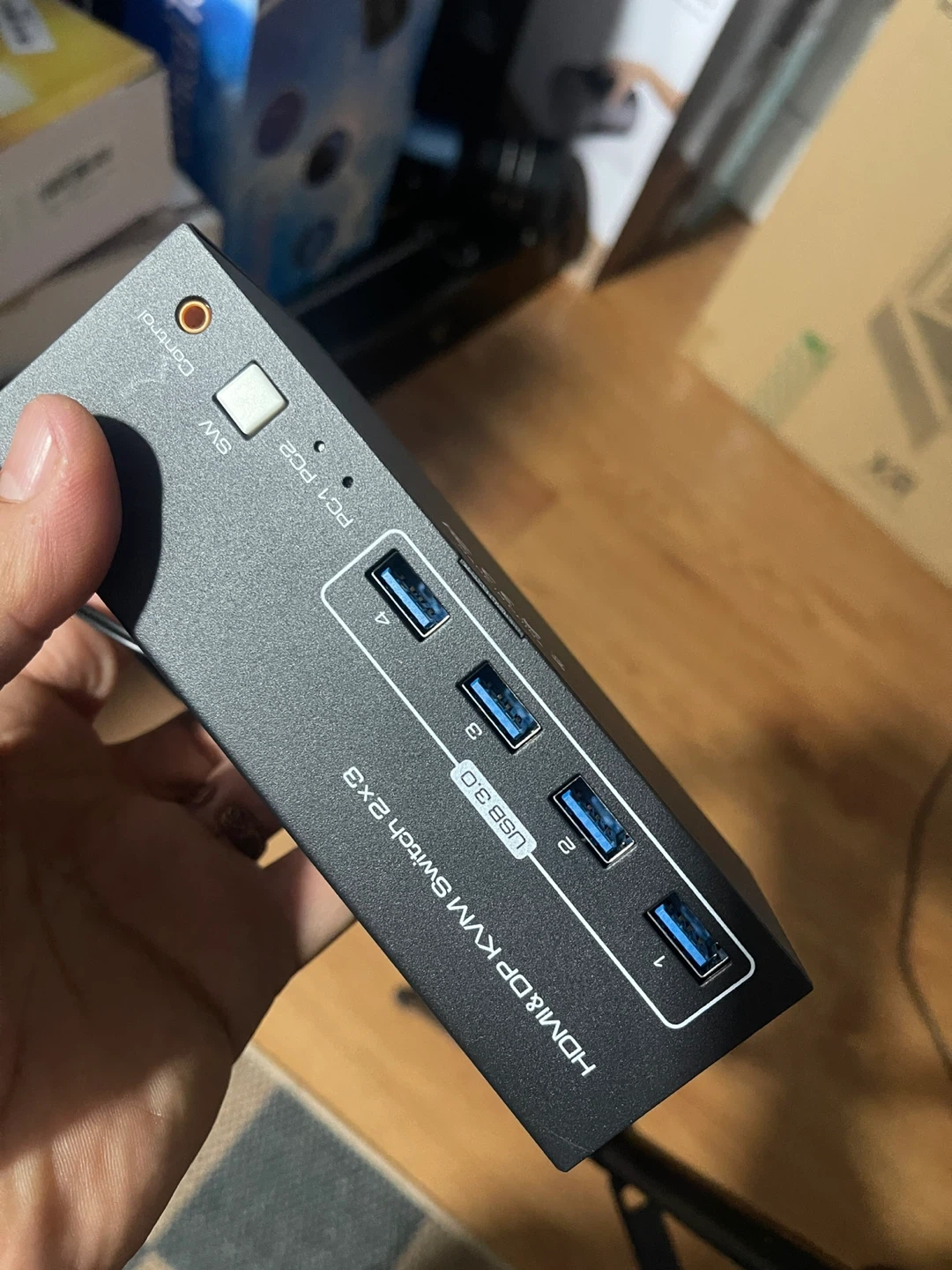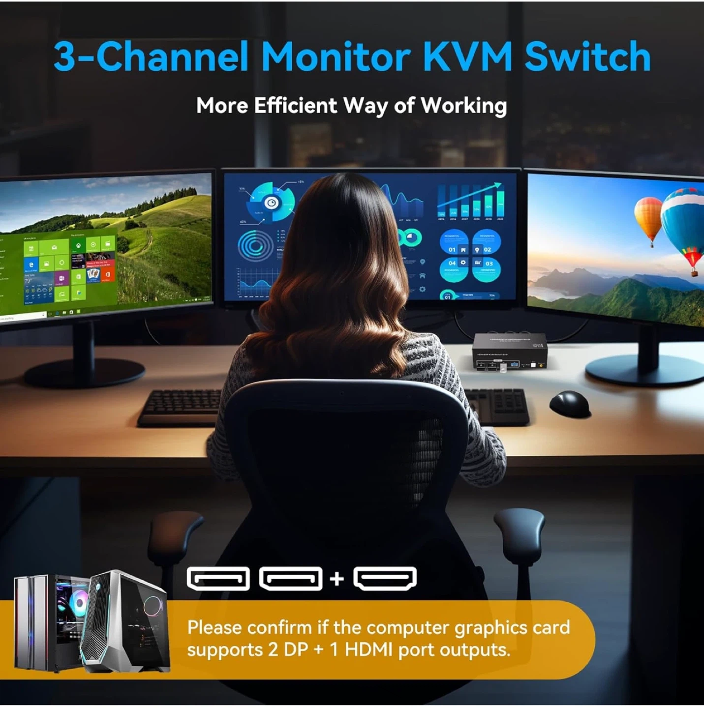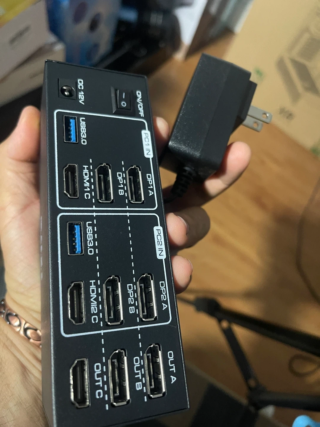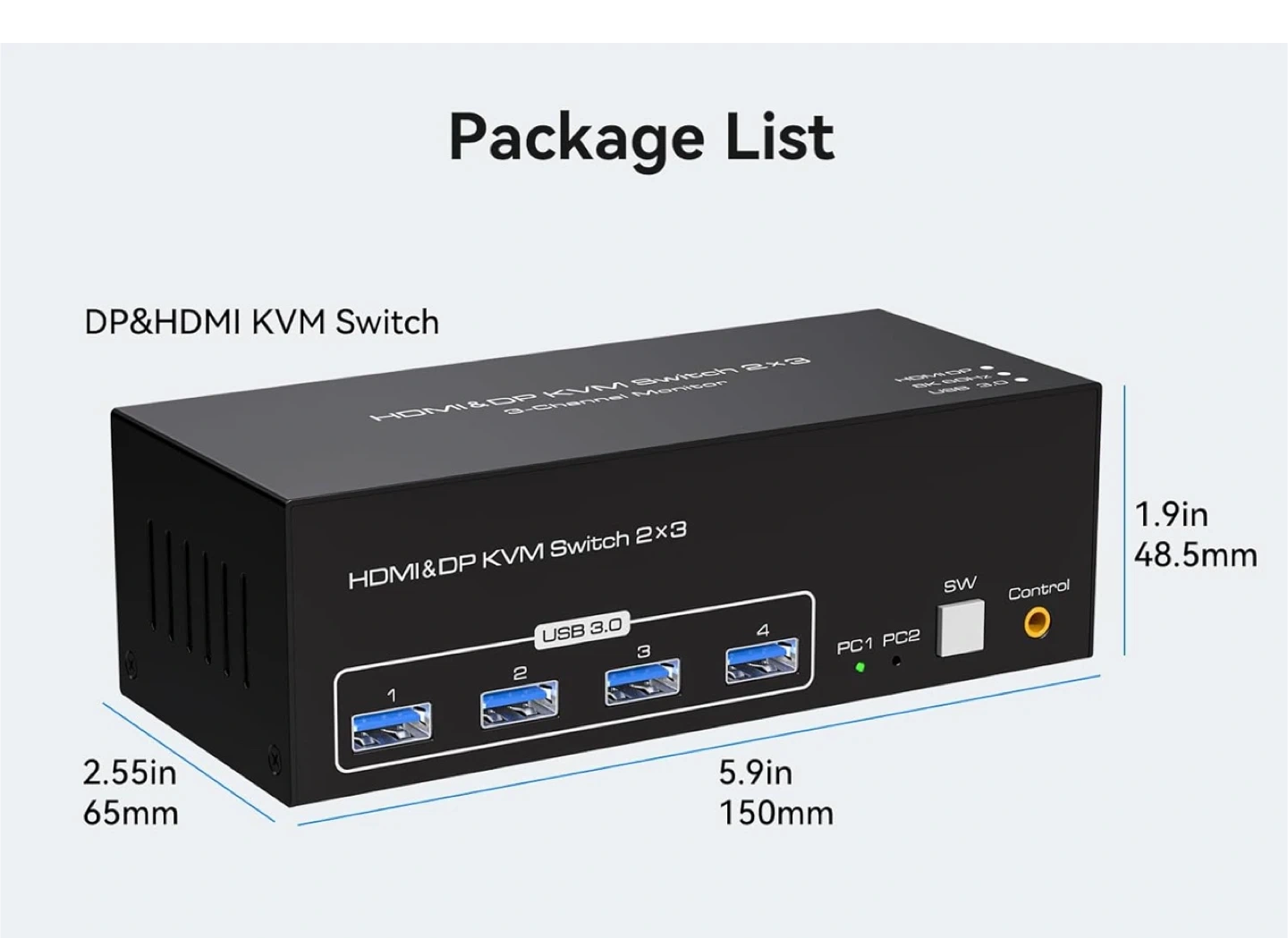 Selling a HDMI&DP KVM Switch 2x3 for a 3-Channel Monitor setup! It supports HDMI&DP, 8K 60Hz, and USB 3.0. It allows for USB 3.0 transfer files in seconds. It is 5.9in x 2.55in x 1.9in. Included is the power adapter.