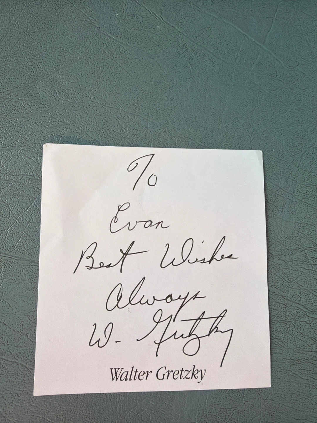 This is a personal note addressed to Evan, featuring a signed message and signature from Walter Gretzky. It's a nice keepsake for any hockey fan. The note includes best wishes and an autograph.