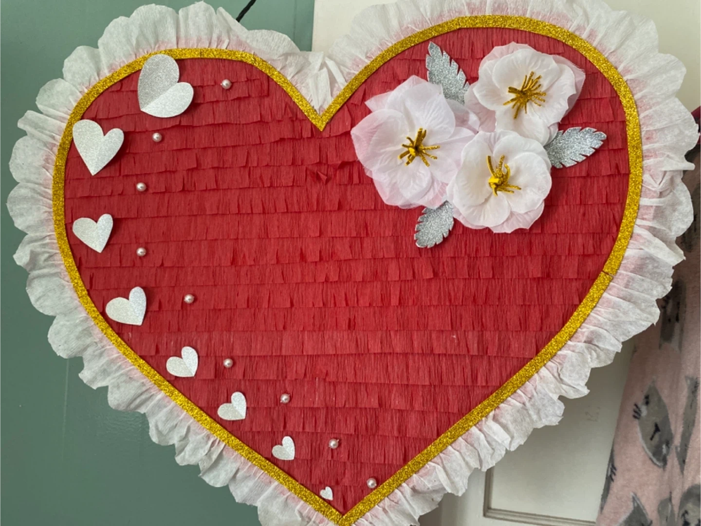 10This is a heart-shaped piñata, perfect for Valentine's Day or any celebration of love! It's decorated with white paper flowers, silver leaves, and small white hearts, with a gold trim. Hand made, durable