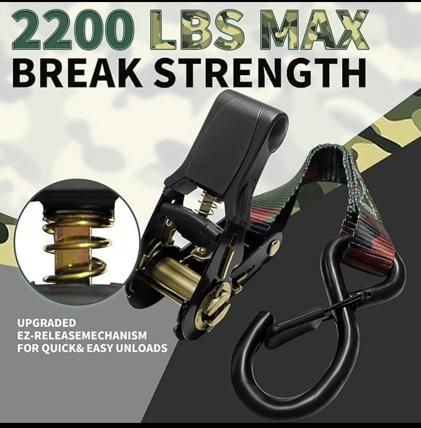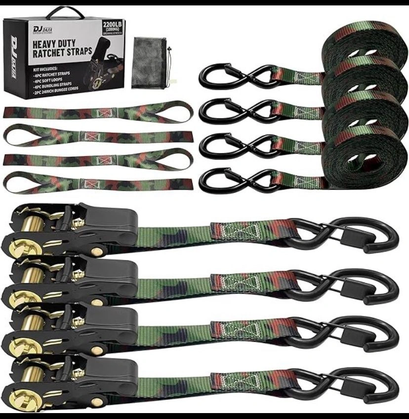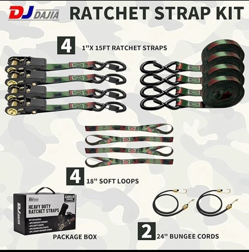 AS IS, NEW!!! Ratchet Strap Kit Contents: 4 metal ratchet buckles with rubber grips, 4 soft loop straps, 4 heavy-duty 1" S-hook straps, and a compact carrying case. Strength: 2200 lb break strength for reliable cargo security. Security: Locks firmly in place to keep your load safe during transport. Versatility: 15-ft straps ideal for securing UTVs, ATVs, dirt bikes, motorcycles, and more.