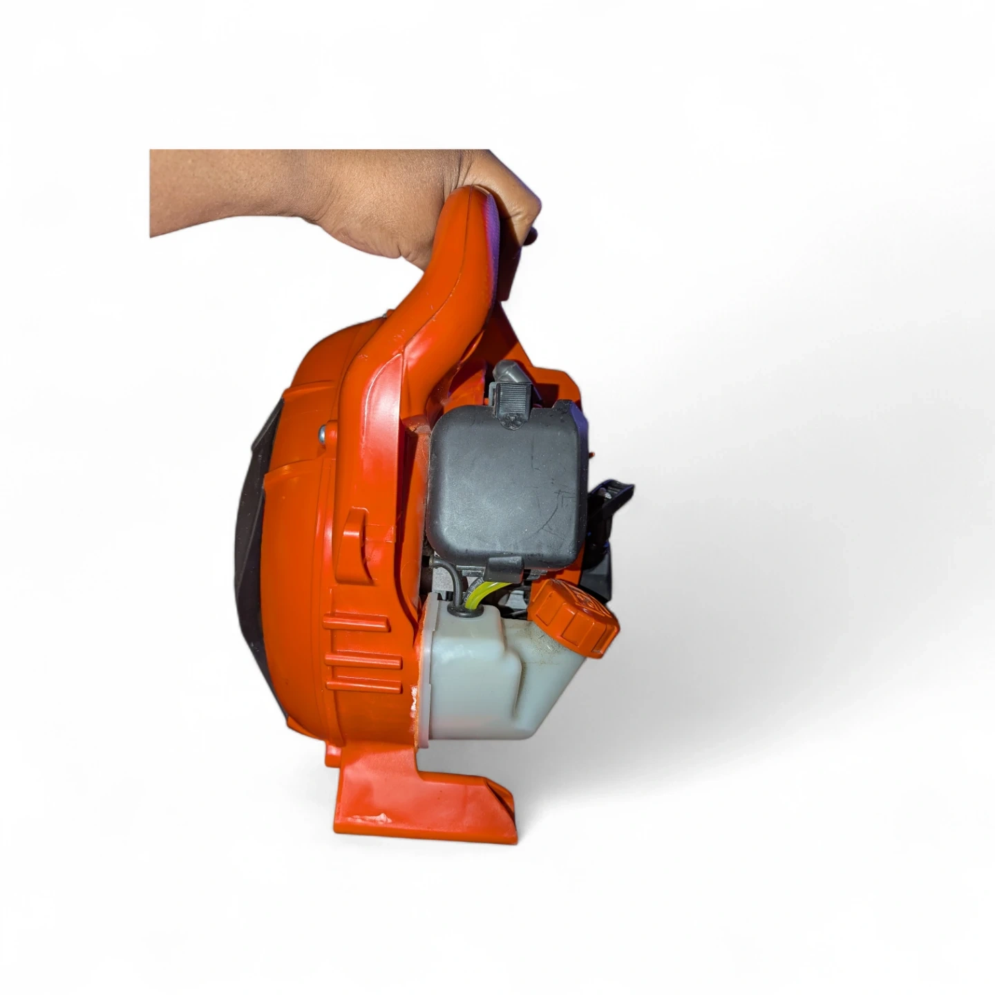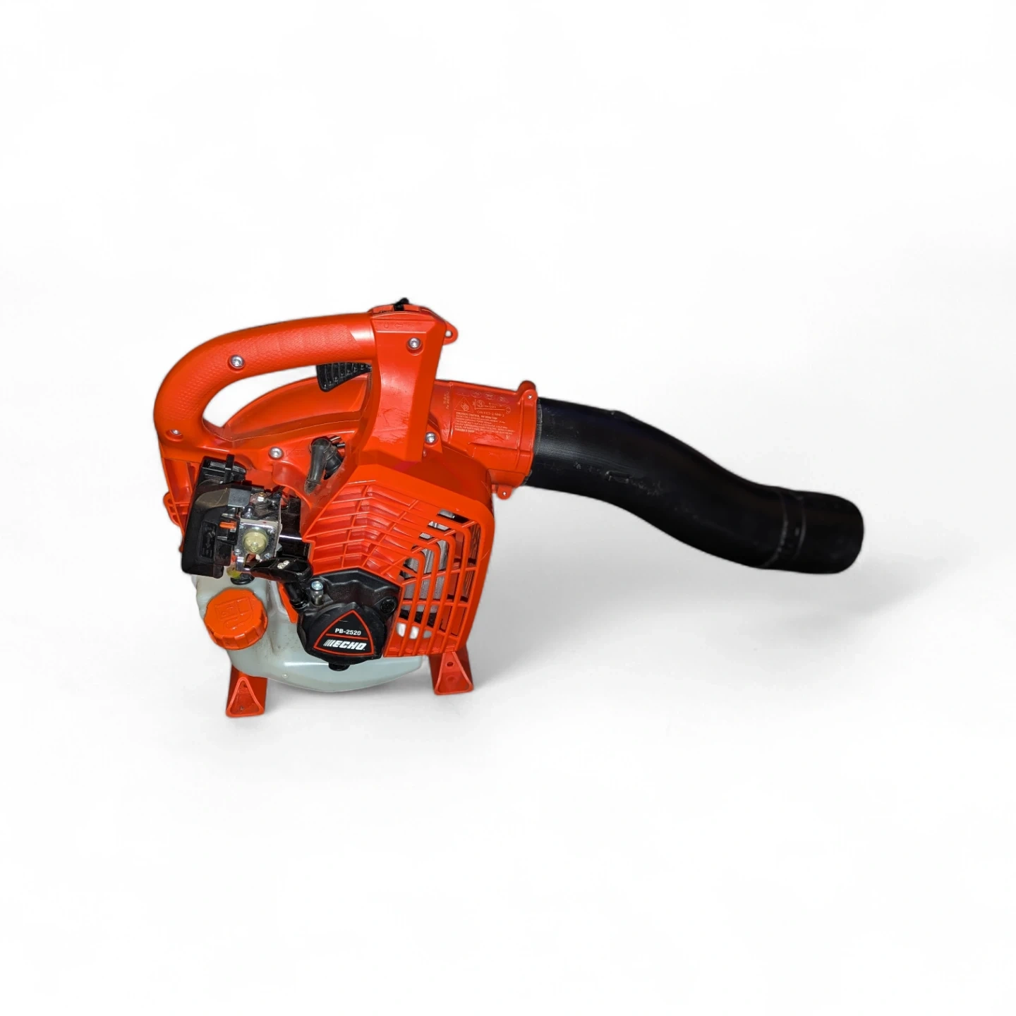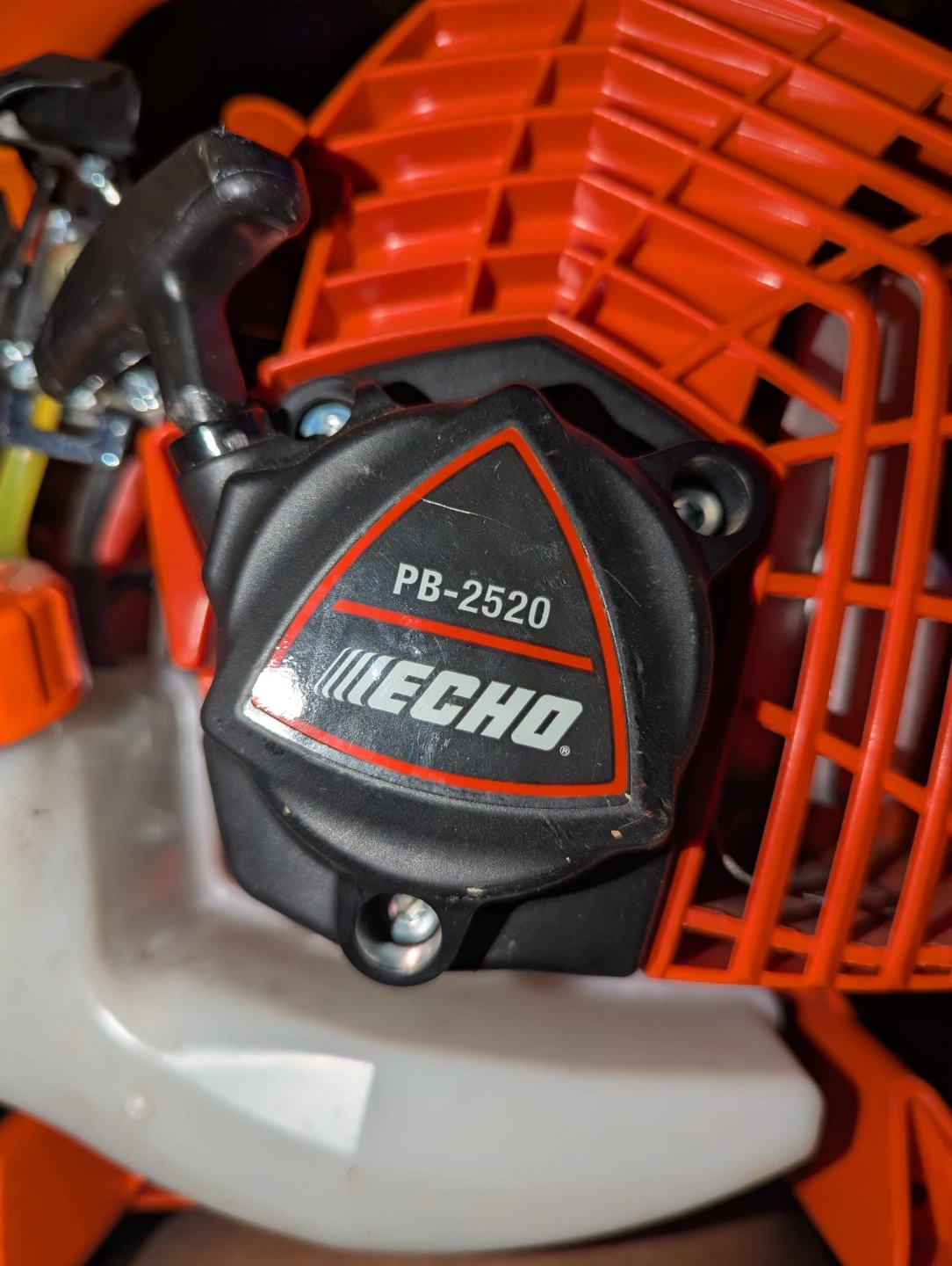 This Echo leaf blower is model PB-2520. It's orange and black. It comes with a curved tube and a starter cord. It has a translucent gas tank.
