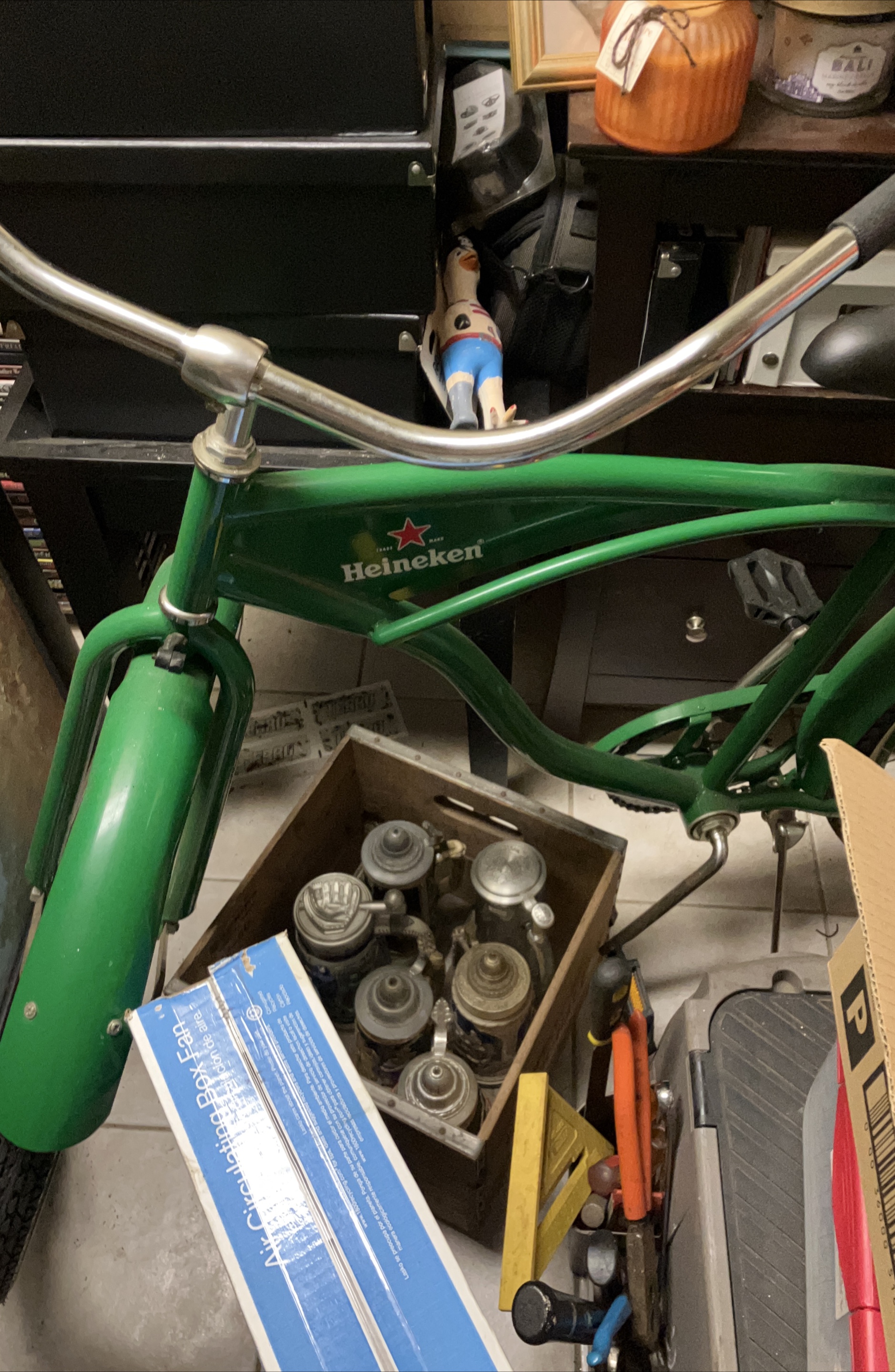 Selling a green Heineken bicycle. It's in good condition and ready for a new home! The frame is green with the Heineken logo. Perfect for cruising around town!