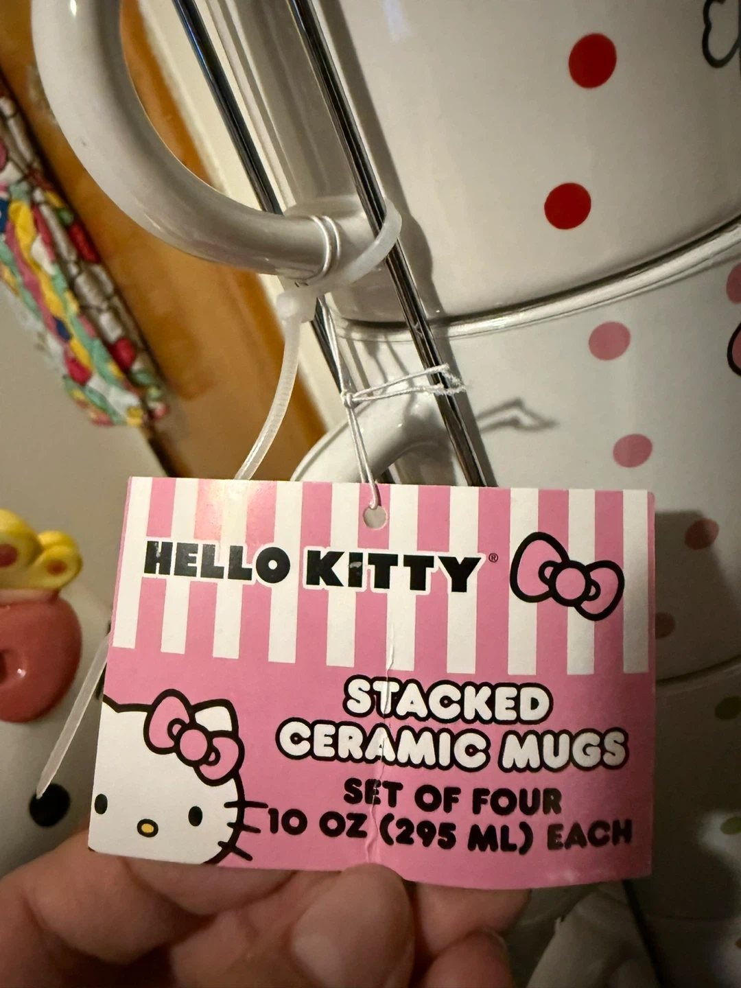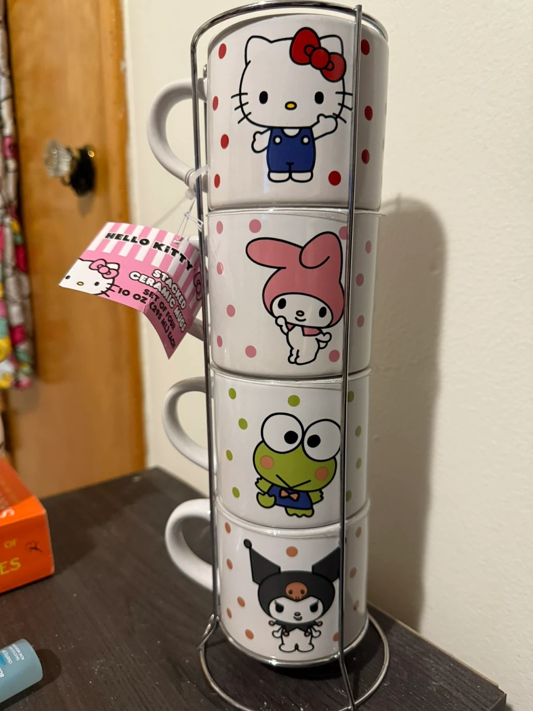 Selling a super cute set of Hello Kitty stacked ceramic mugs! This set includes four mugs, each with a different Sanrio character: Hello Kitty, My Melody, Keroppi, and Kuromi. Each mug holds 10 oz (295 mL). Perfect for any Sanrio fan!
