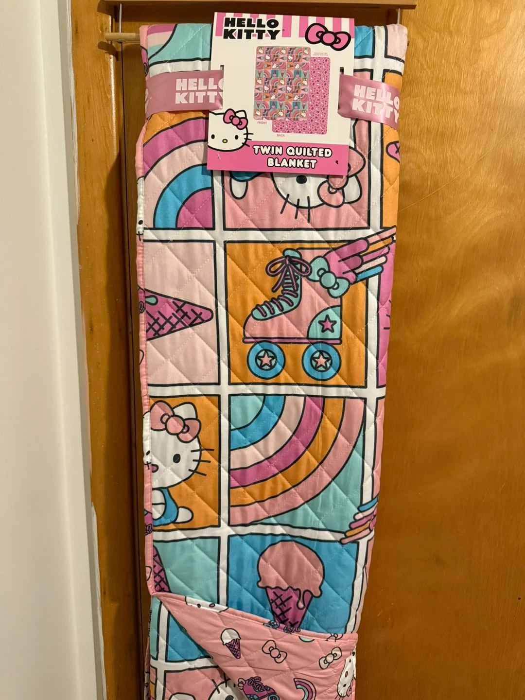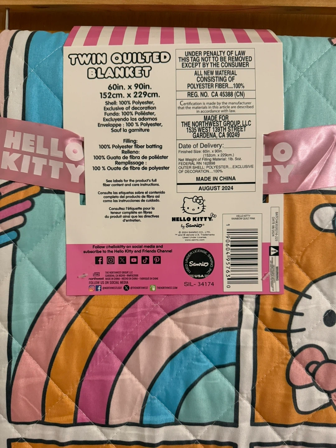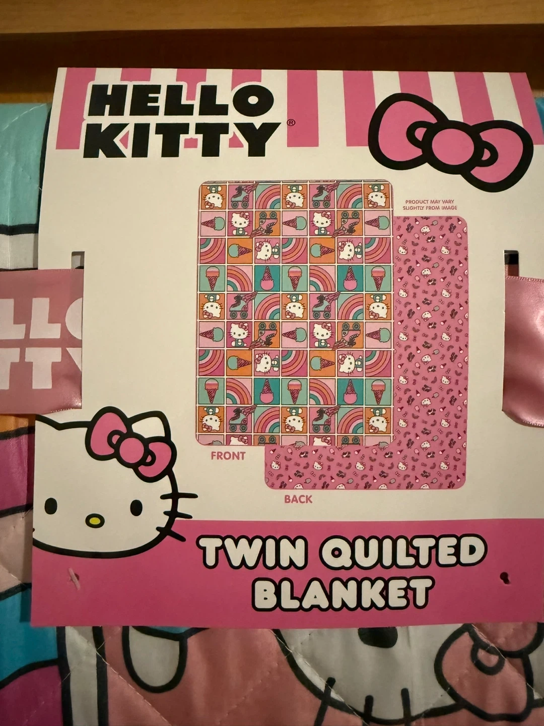 I'm selling a brand new Hello Kitty twin quilted blanket! It's still in the original packaging. The blanket is 60 inches by 90 inches (152 cm x 229 cm). The filling is 100% polyester fiber batting and the decoration is 100% polyester