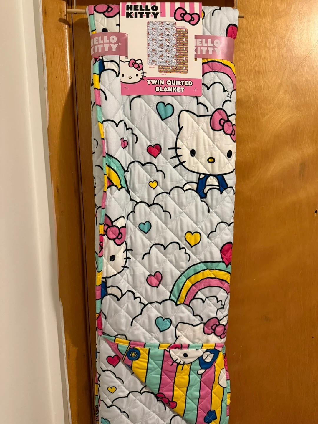 I'm selling a brand new Hello Kitty twin quilted blanket! It's still in its original packaging. The blanket is 60in x 90in (152cm x 229cm) and made of 100% polyester.