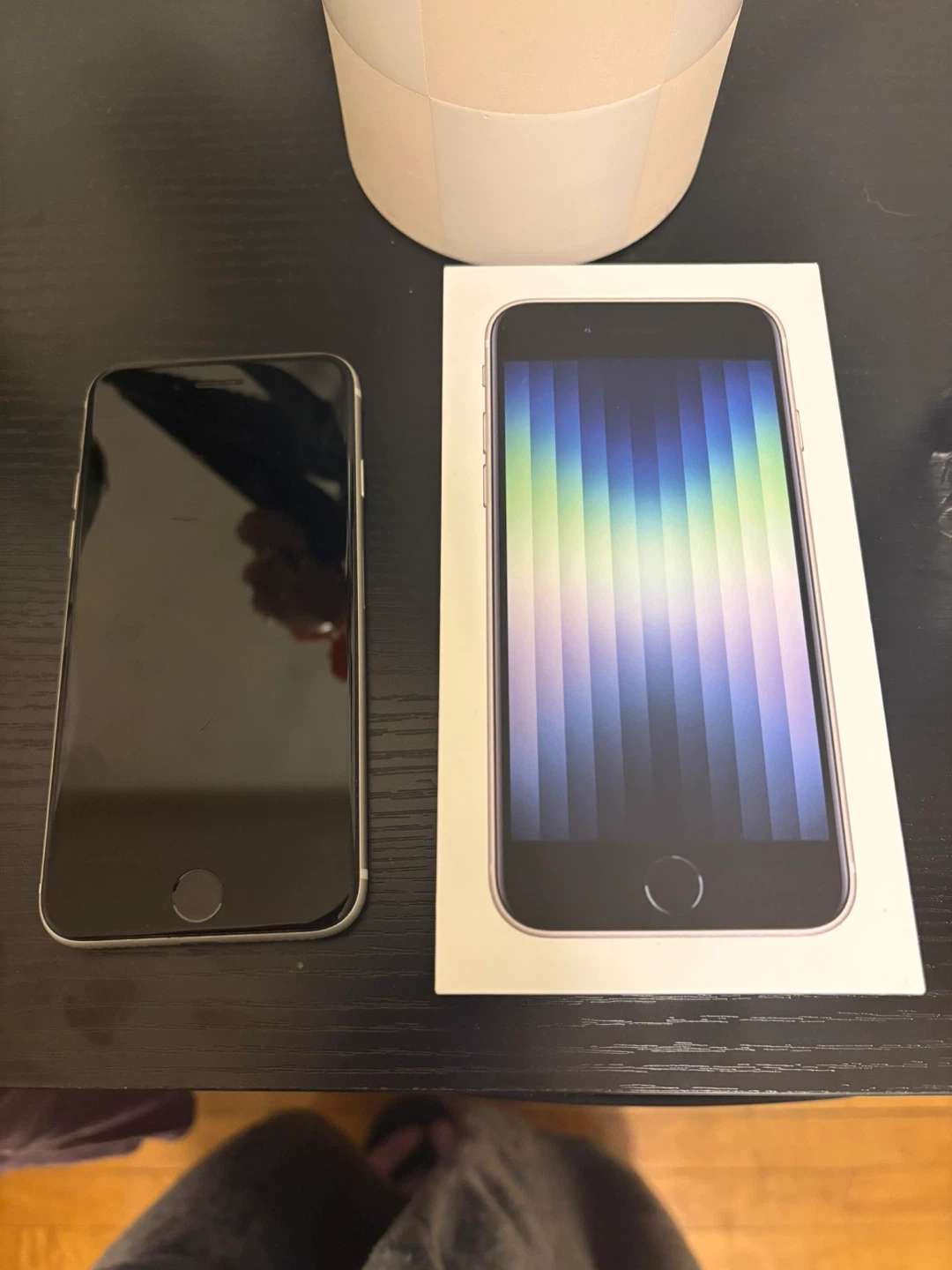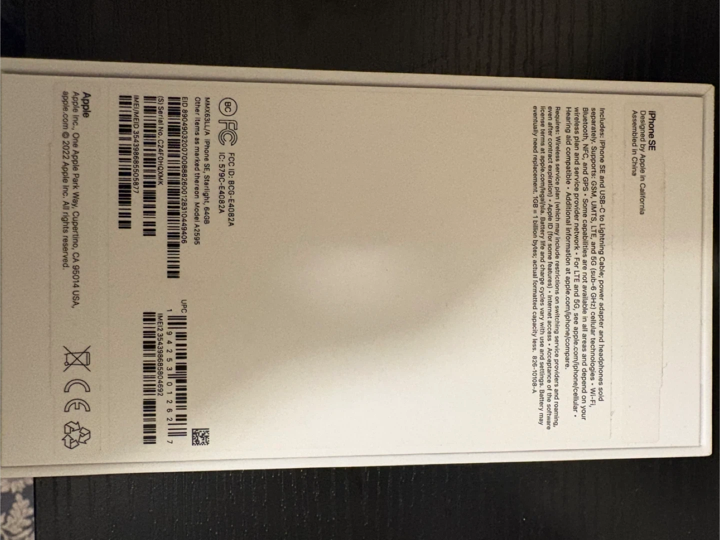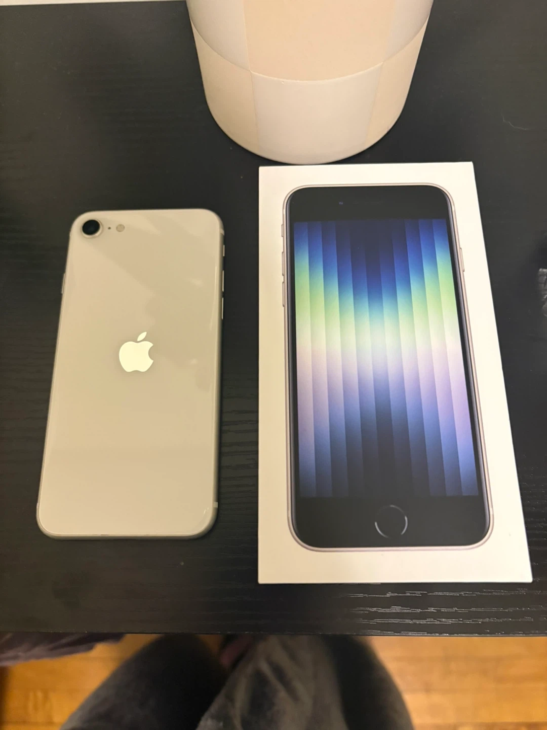 This is an Apple iPhone SE, 3rd generation, in Starlight. It's a 64GB model. Includes original box. Wireless charging, Wi-Fi, and cellular capabilities supported. Fits iPhone SE (3rd gen).