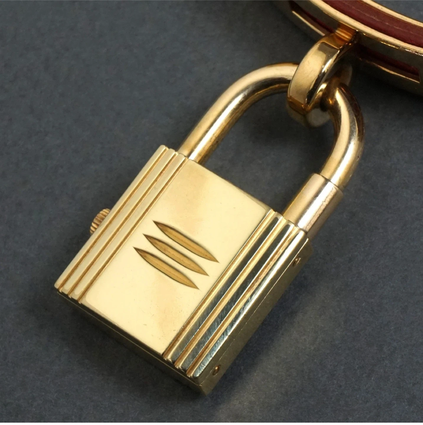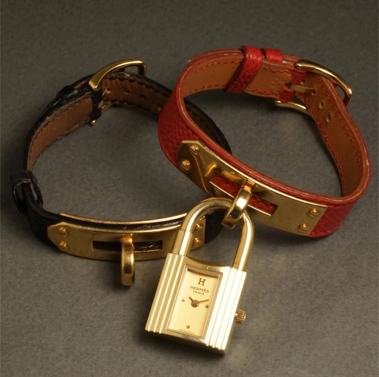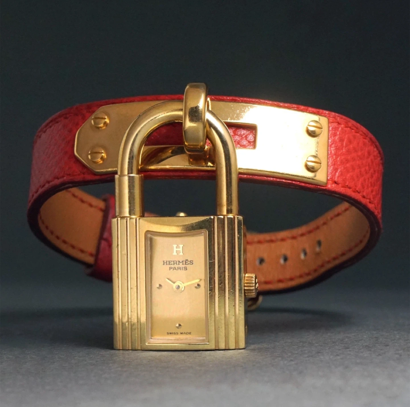 Selling a beautiful Hermès Paris Kelly watch with interchangeable red and black leather bands. The watch features a gold-tone padlock case and a classic design. It's a stylish and iconic accessory!