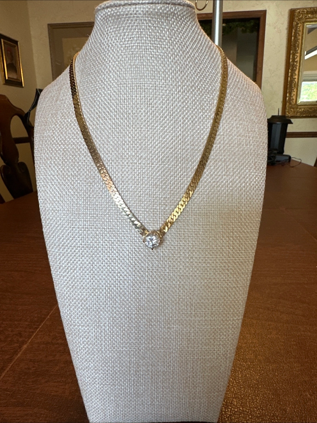 Selling a beautiful herringbone chain necklace. It features a lovely gold tone and a sparkling cubic zirconia stone. Perfect for adding a touch of elegance to any outfit!