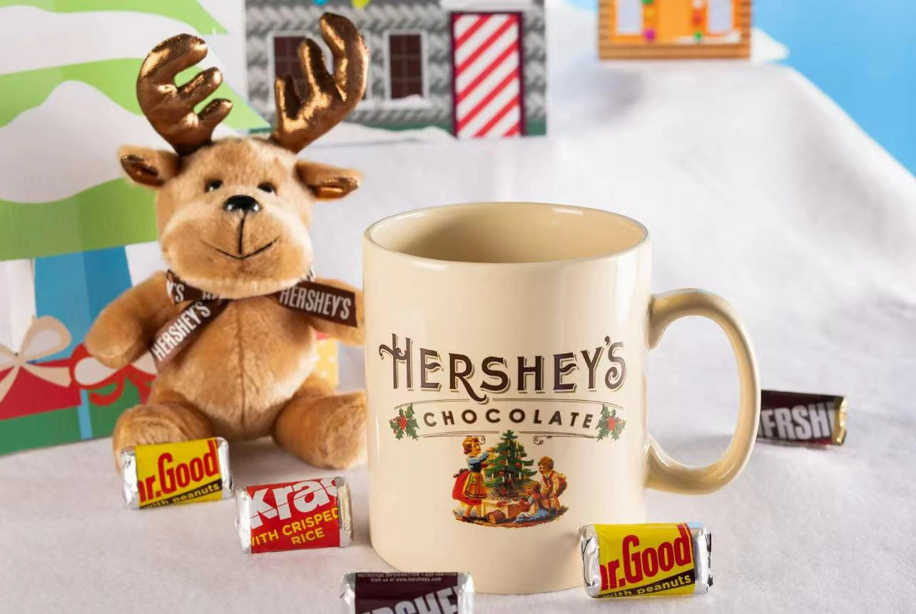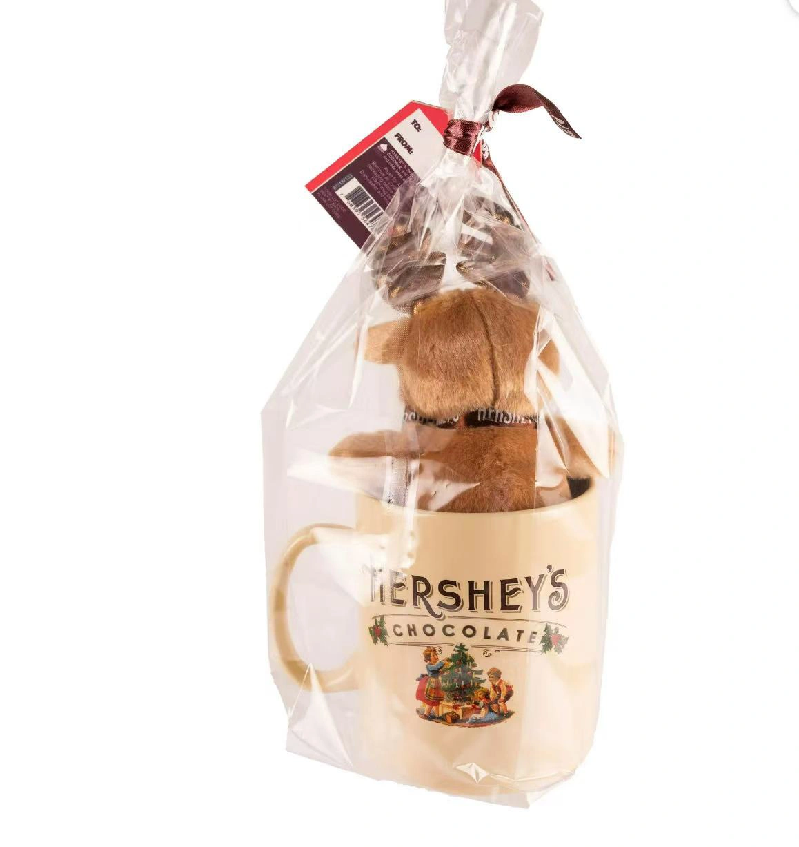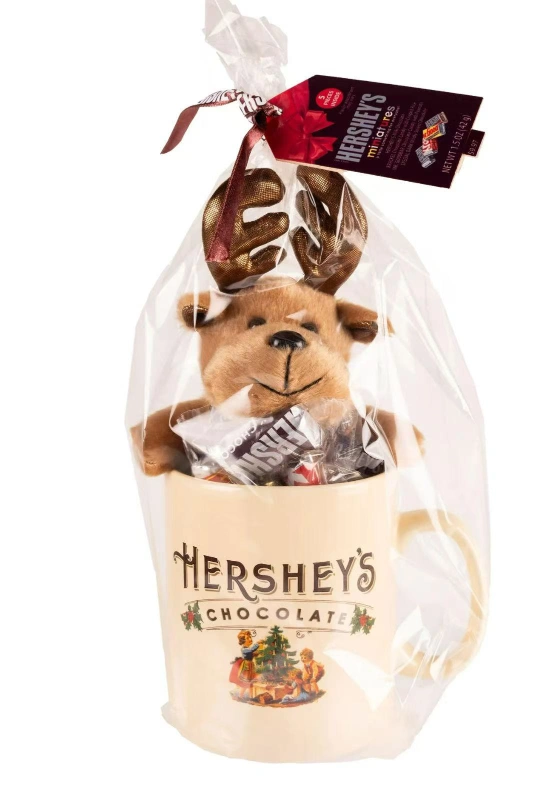 The gift set contains a plush reindeer and Hershey's chocolates. The mug is off-white with the Hershey's logo. It is all wrapped in a clear plastic bag. Sipping hot cocoa from the mug on a cold day is a great way to relax.