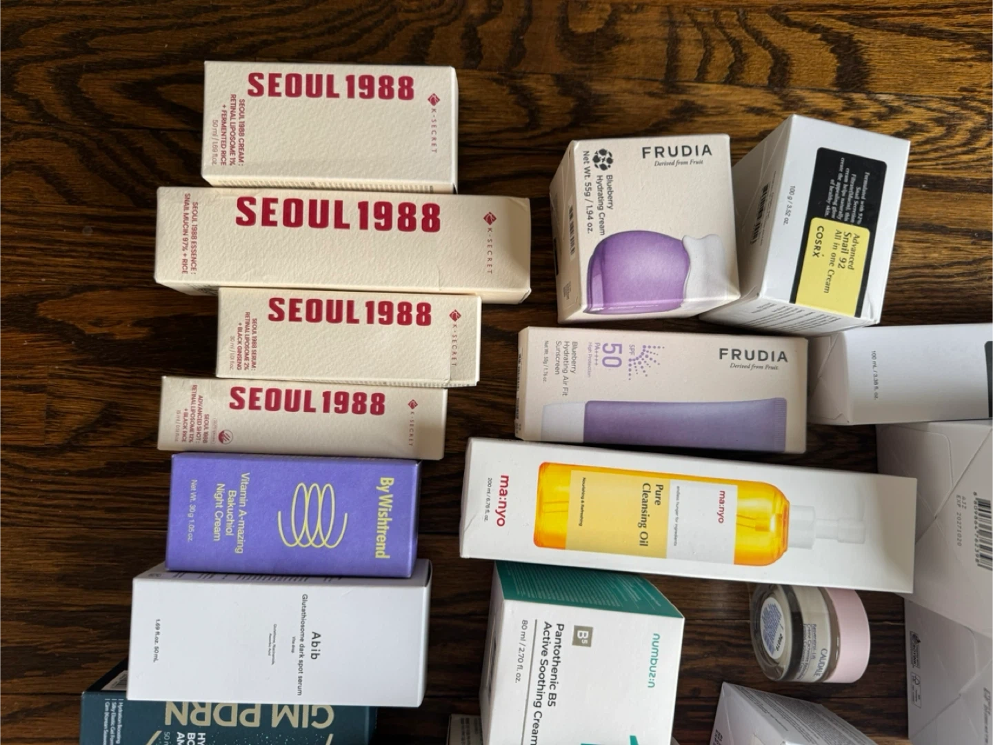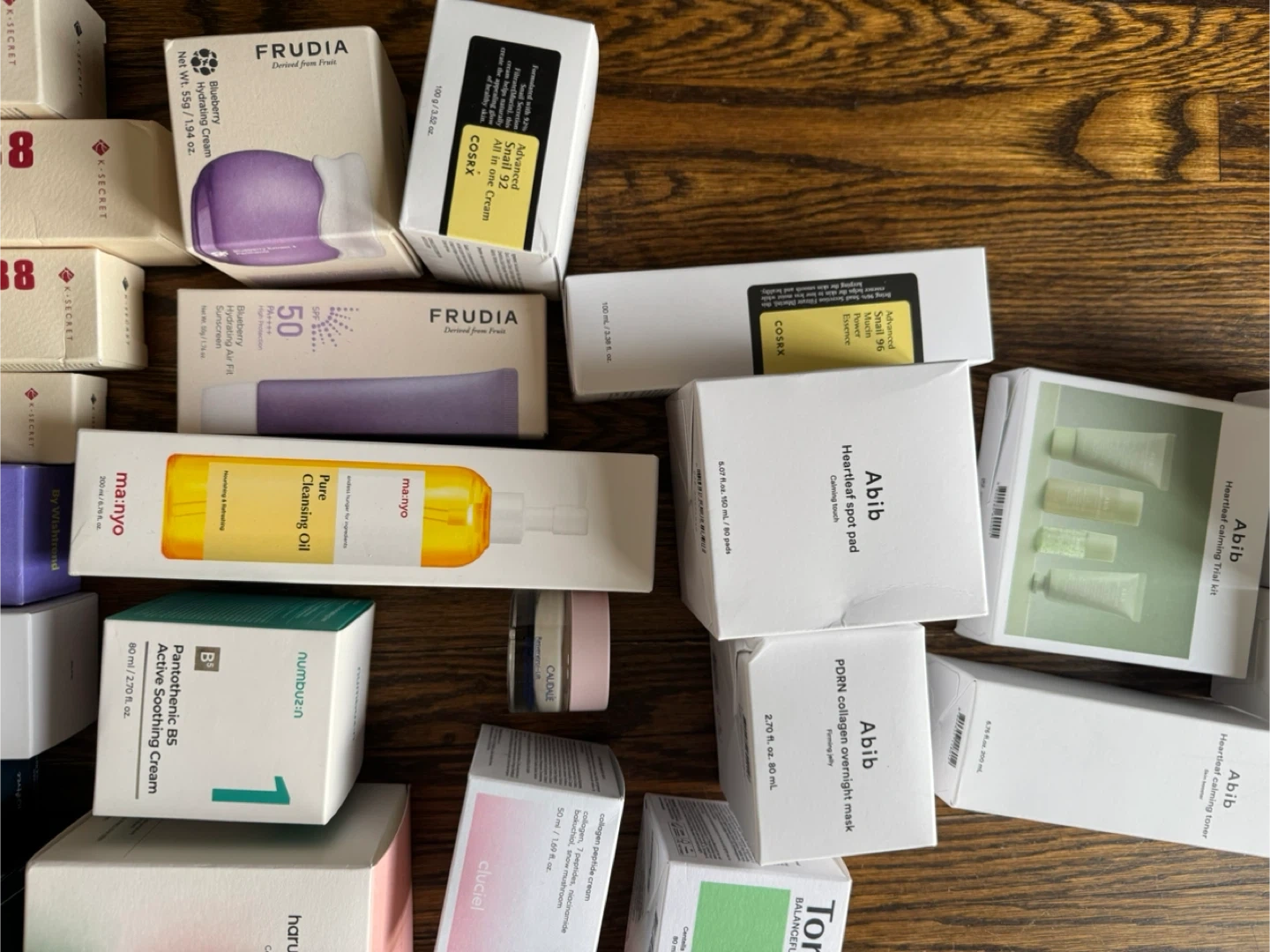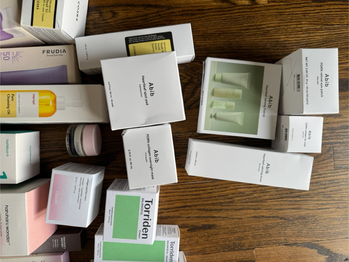 A selection of various Korean skincare products including toners, serums, creams, and masks. Includes items from brands like COSRX, Abib, Manyo, Frudia, Torriden, and Celimex..