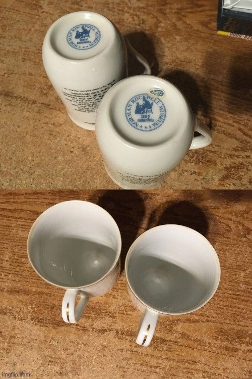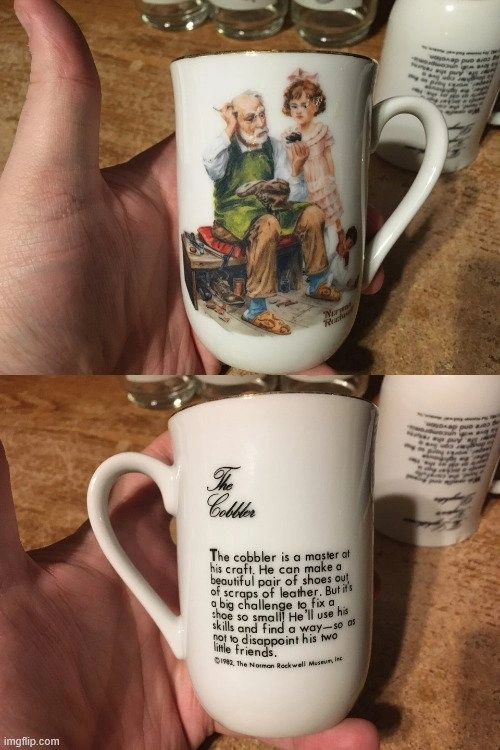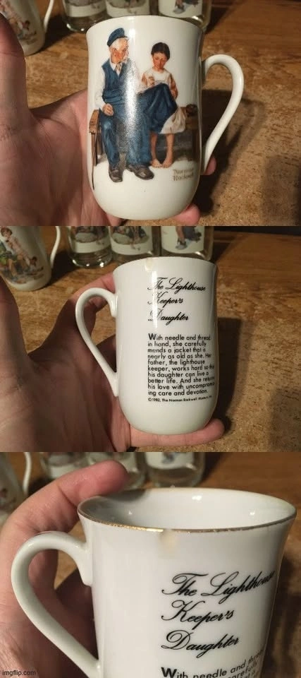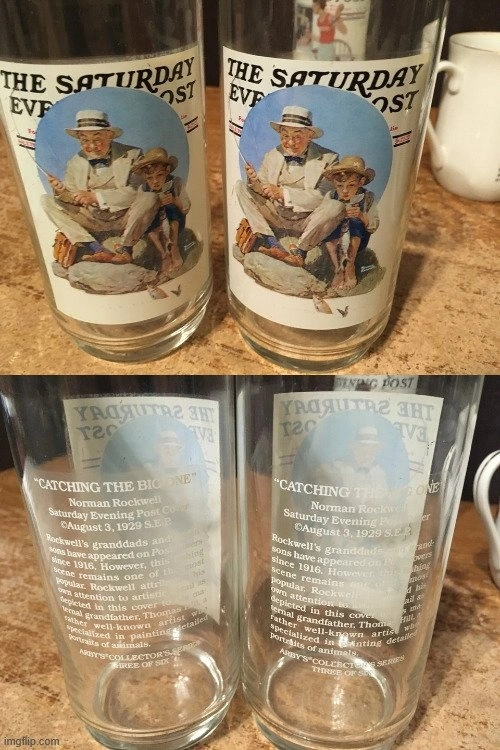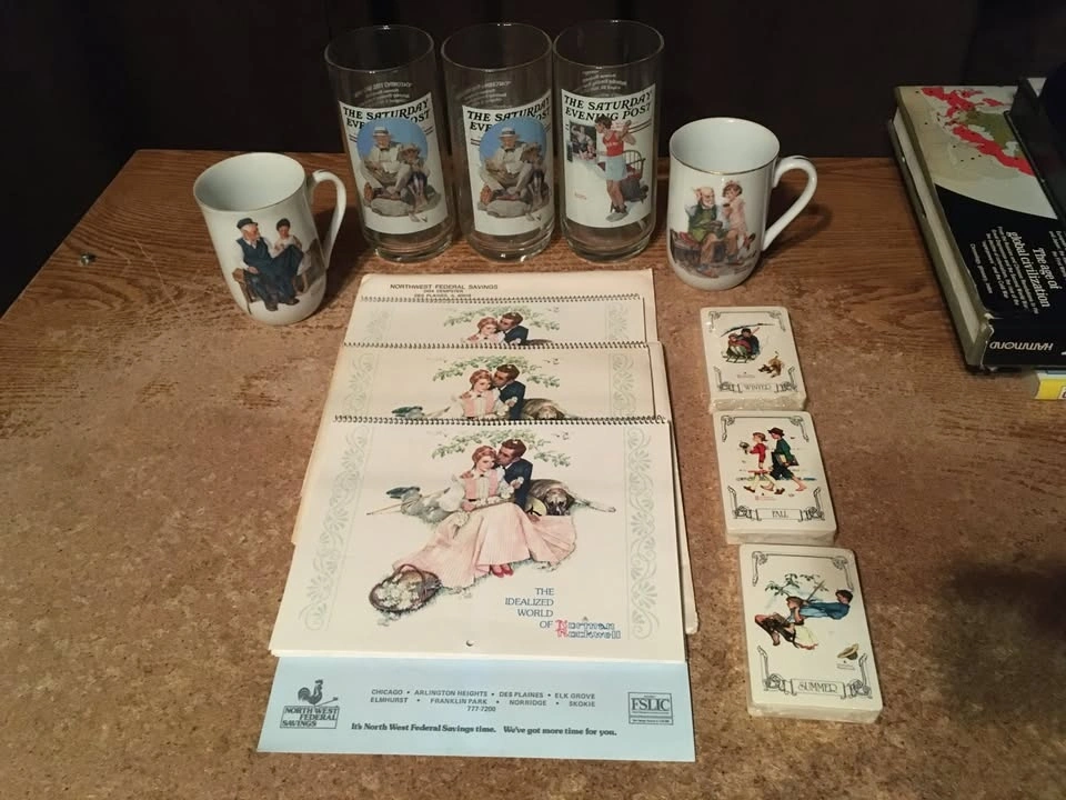 Includes: 3 Arby's Norman Rockwell glasses (2x 'Catching the Big One', 1x 'The Champ'). Glasses are in excellent condition with a small scratch on one. 2x 1982 Norman Rockwell Museum cups ('The Cobbler' & 'The Lighthouse Keeper's Daughter'). 'The Lighthouse Keeper's Daughter' has a small chip. 3x 1981 'The Idealized World of Norman Rockwell' calendars. Two come with envelopes. One calendar has a little wear. Lot of 3 sealed Norman Rockwell playing cards ('Seasons: Summer, Fall, Winter'). 11 items total. Cash only.