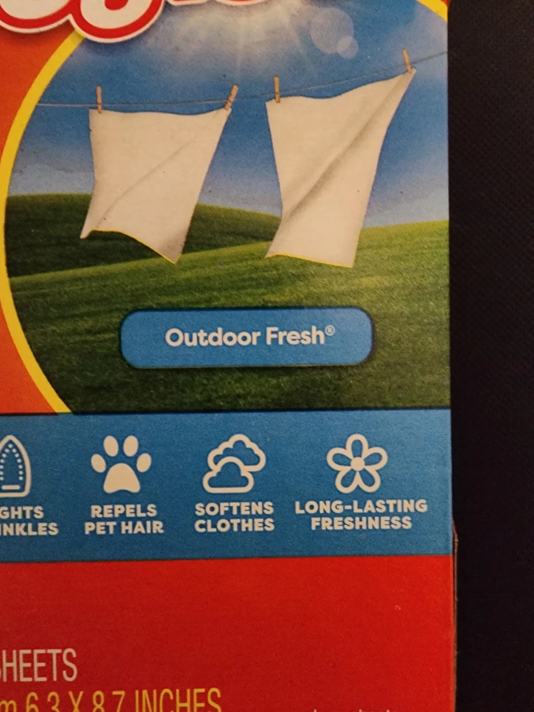 Bounce dryer sheets in Outdoor Fresh scent. Box includes 160 sheets measuring 16 x 22 cm (6.3 x 8.7 inches). They fight static, wrinkles, repel pet hair, soften clothes, and provide long-lasting freshness.